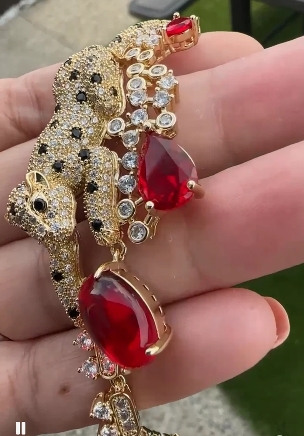 Selling a unique gold-tone bracelet featuring a leopard design adorned with black spots and clear gemstones. It also has a variety of coloured gemstones, including red and green, adding a vibrant touch to the piece