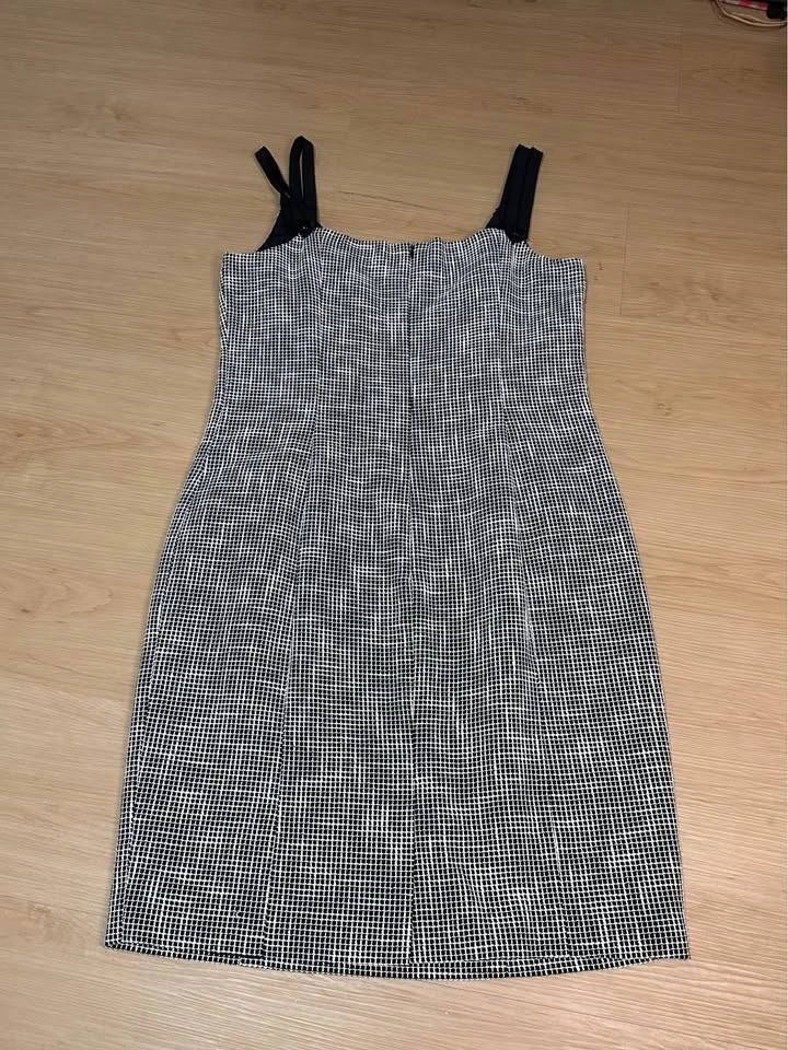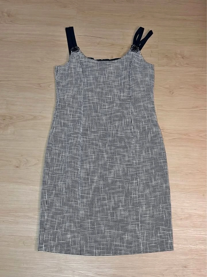 Elegant and timeless Carolina Herrera New York dress from the main luxury line. This sophisticated black and white micro-pattern dress features a classic A-line / fit-and-flare silhouette, structured bodice with wide ribbon straps, and a decorative floral embellishment at the strap. It's fully lined with a subtle star-pattern jacquard and has a hidden back zipper closure. Size 10. A polished, "old money" style piece perfect for cocktail events, weddings, or gallery openings. Beautiful tailoring and signature Carolina Herrera femininity. Excellent pre-owned condition. No visible flaws. Well maintained. Midtown Toronto.