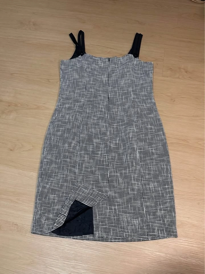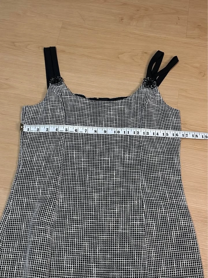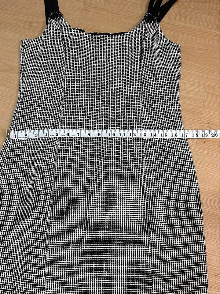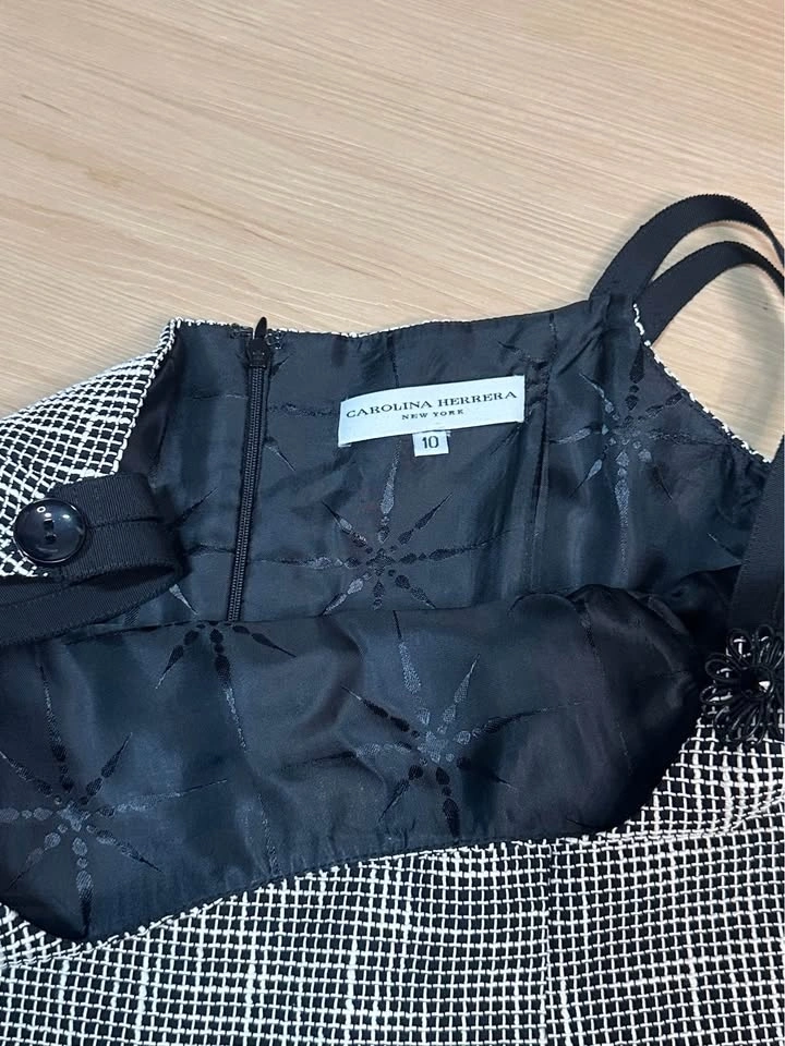 Elegant and timeless Carolina Herrera New York dress from the main luxury line. This sophisticated black and white micro-pattern dress features a classic A-line / fit-and-flare silhouette, structured bodice with wide ribbon straps, and a decorative floral embellishment at the strap. It's fully lined with a subtle star-pattern jacquard and has a hidden back zipper closure. Size 10. A polished, "old money" style piece perfect for cocktail events, weddings, or gallery openings. Beautiful tailoring and signature Carolina Herrera femininity. Excellent pre-owned condition. No visible flaws. Well maintained. Midtown Toronto.