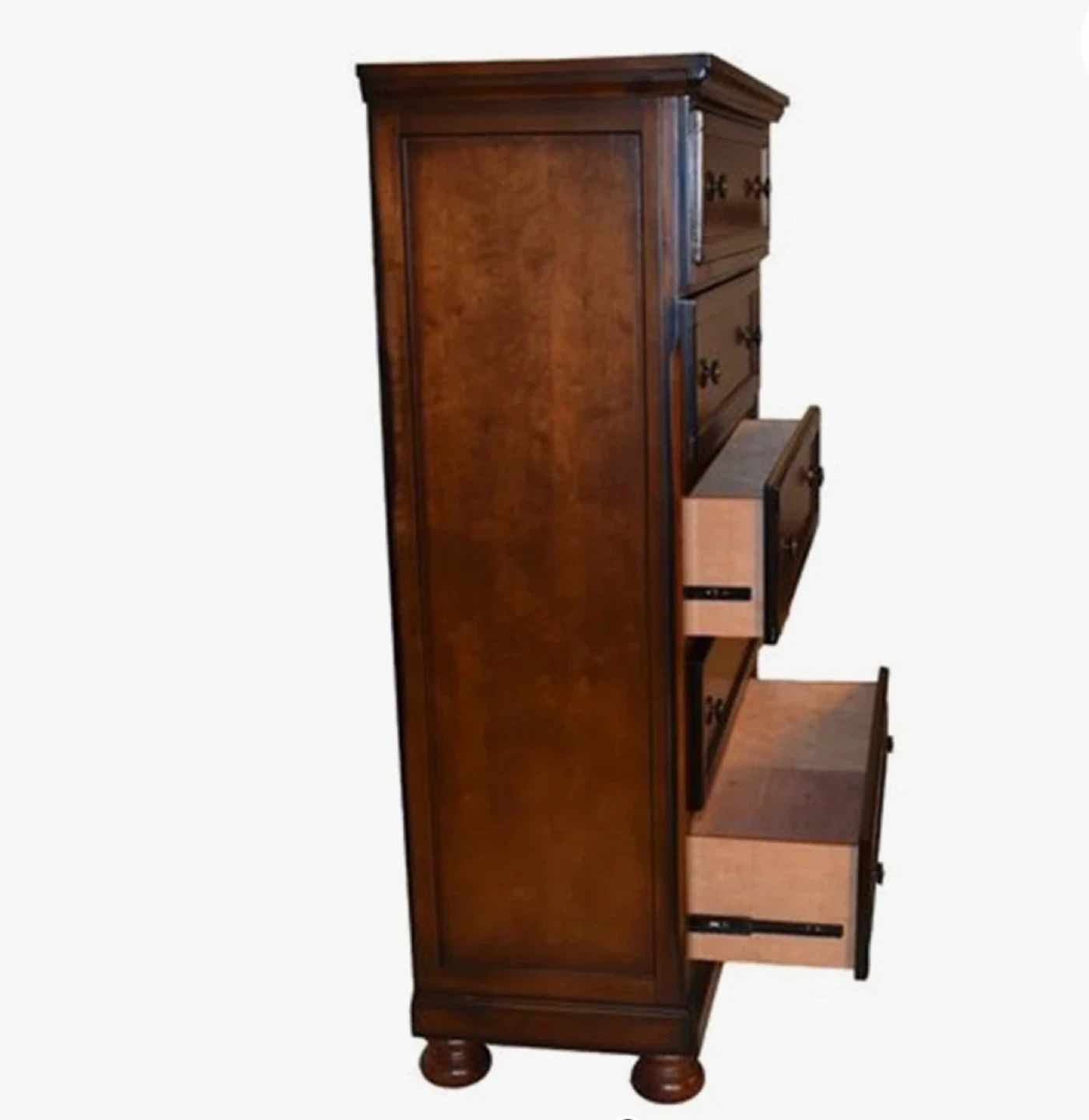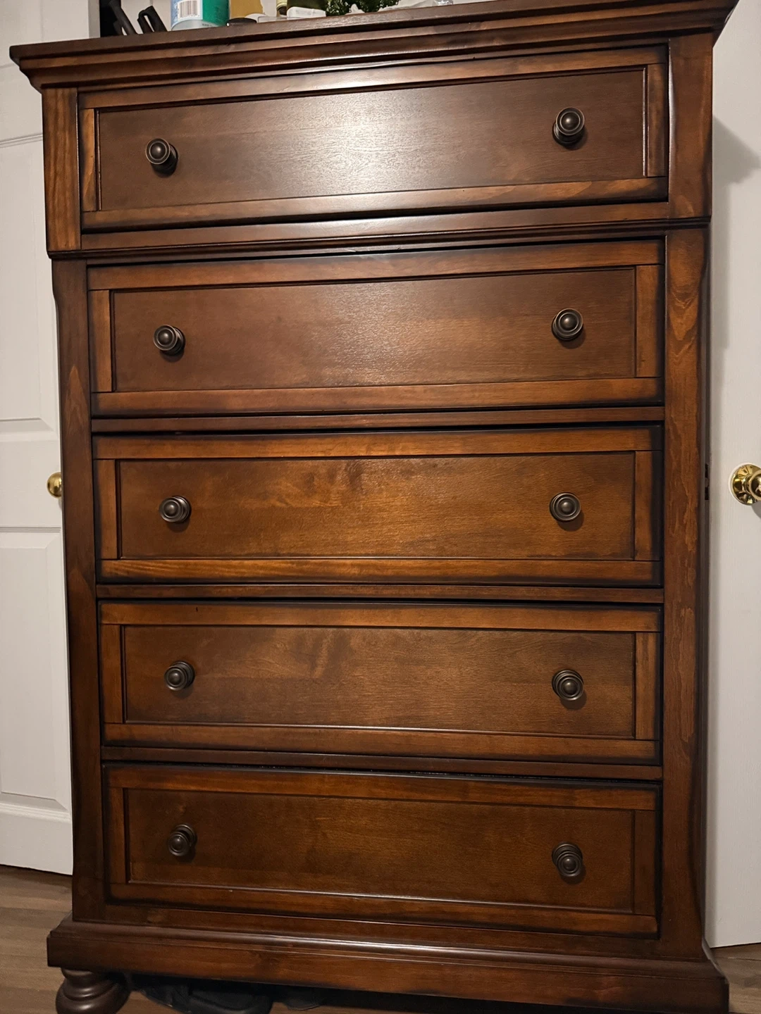 This is a brown wooden chest of drawers, perfect for bedroom storage. It features multiple drawers for organizing clothes and other items. The wood construction offers durability and a classic look.dm for prices