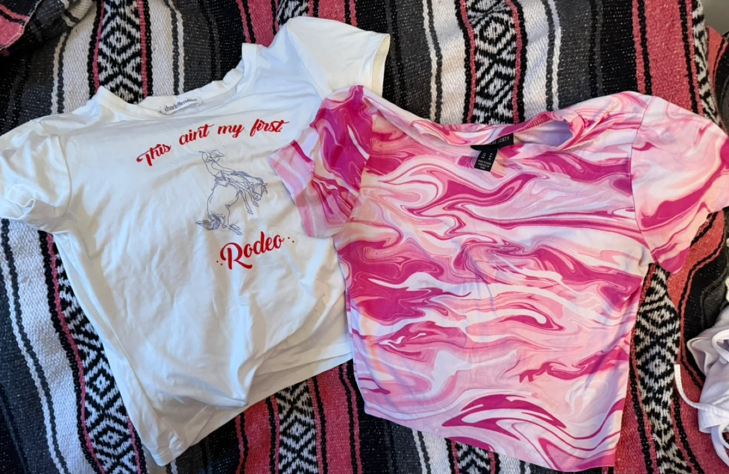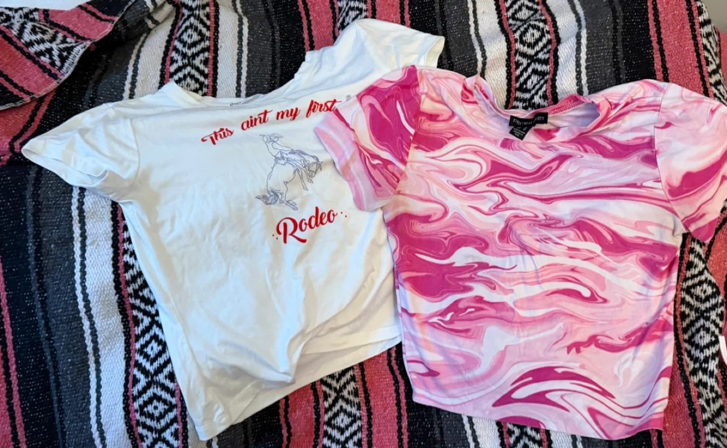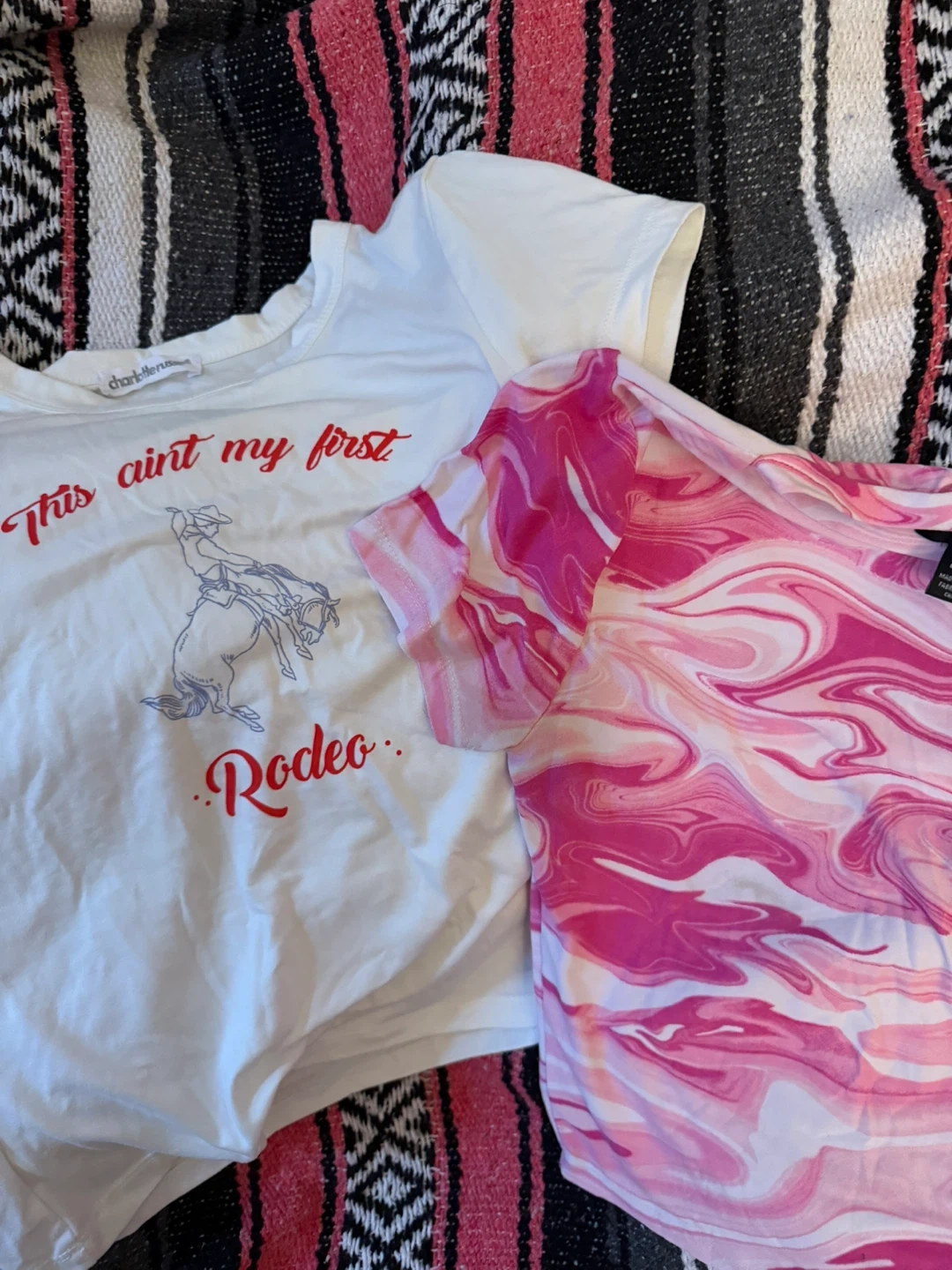 Selling two adorable crop tops! One is white with a 'This ain't my first Rodeo' design. The other is a fun pink marble pattern. Both are size medium and in great condition!