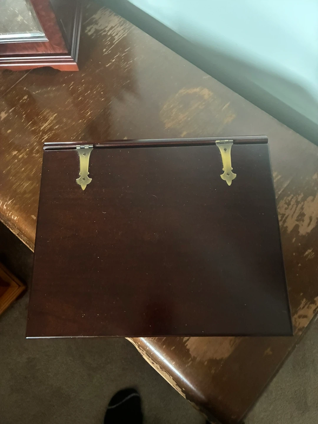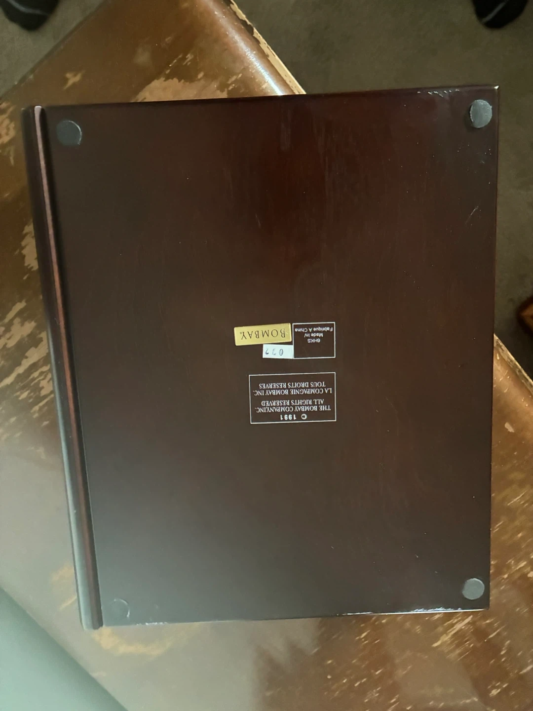 This is a decorative wooden box from Bombay. It features brass hinges and a rich, dark wood finish. It's a lovely piece for storing keepsakes or small treasures.