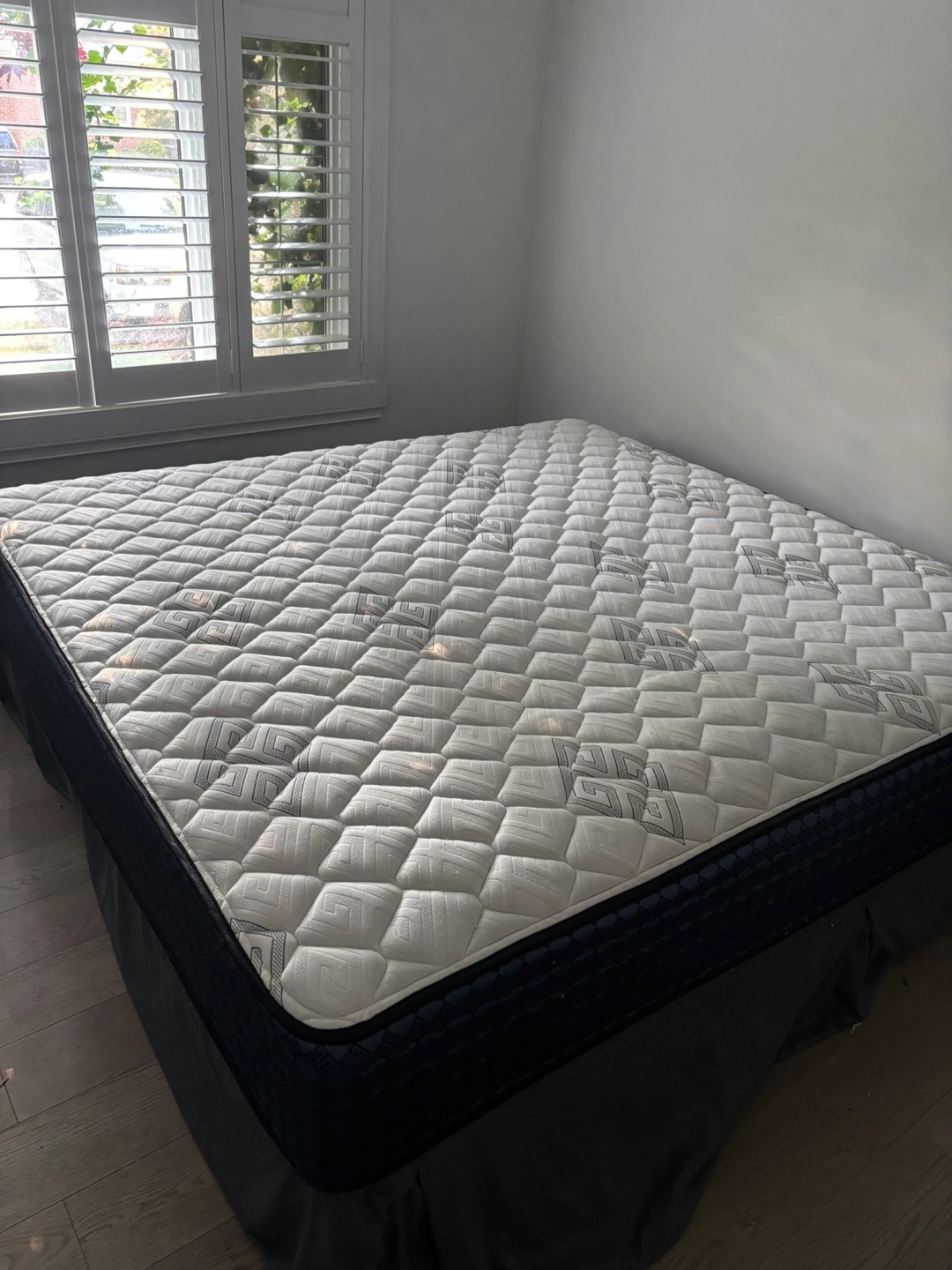 Selling a Kingsdown mattress and two piece box spring in great condition. Super clean. Came from Sleep Country. The mattress is white with a dark blue trim. It's very comfortable and clean. Less than two years old. Mattress is firm. From a smoke free home. Moving, so it needs to go!