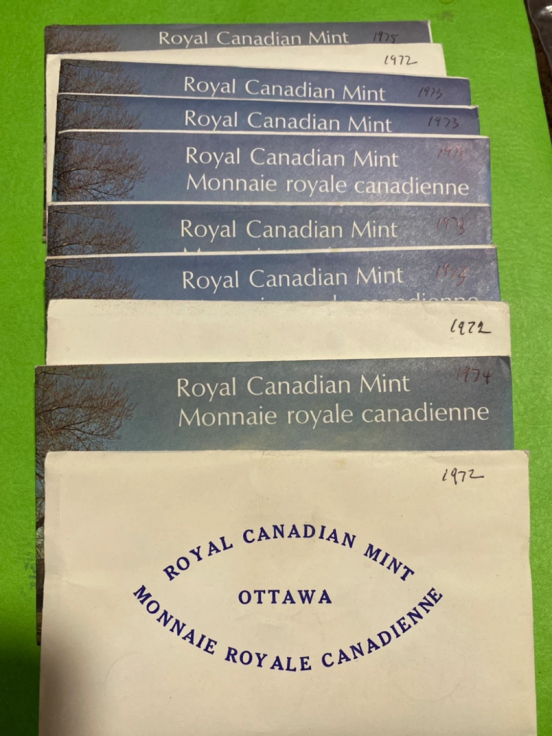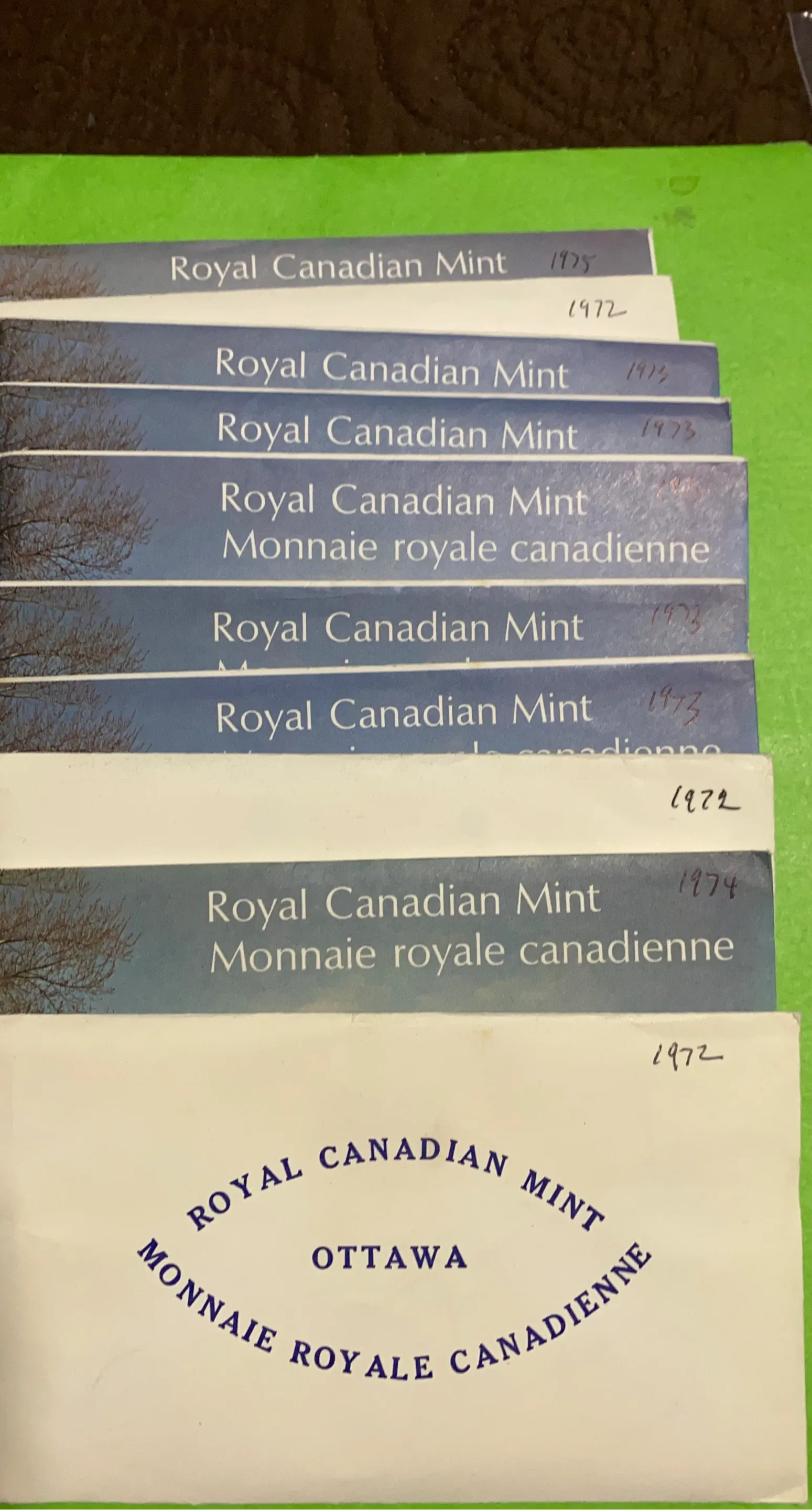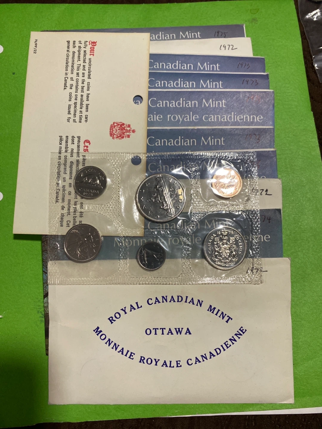 10 SETS. Collection of Royal Canadian Mint coin sets from various years. Includes sets from 1972, 1973, 1974, and 1975. Each set contains uncirculated coins. 10 sets