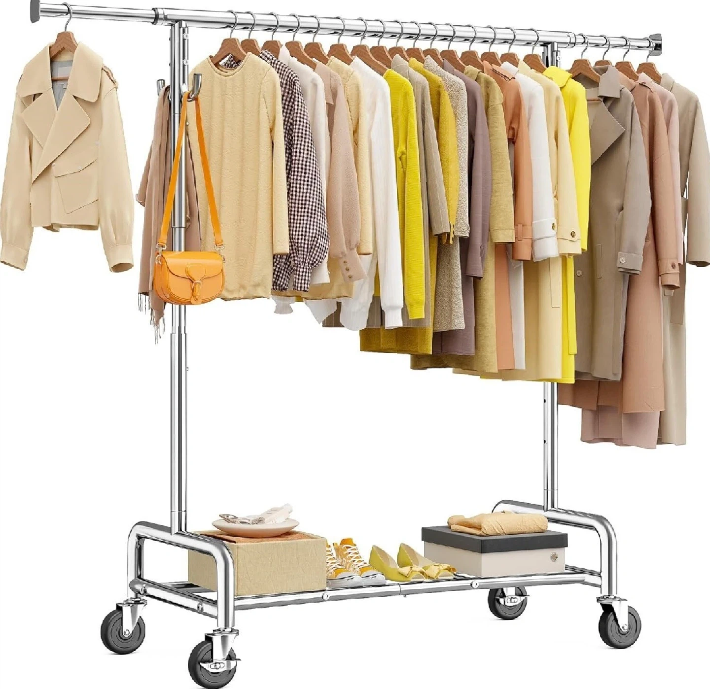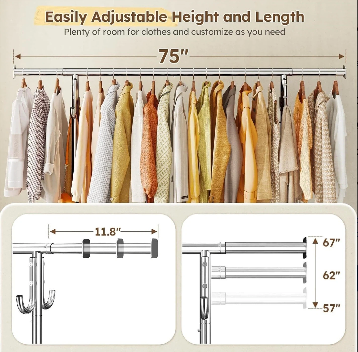 This new heavy-duty clothes rack that measures 75 inches and can hold up to 450lbs. This rack comes in its original, unopened box, ready for easy assembly to help organize your wardrobe.