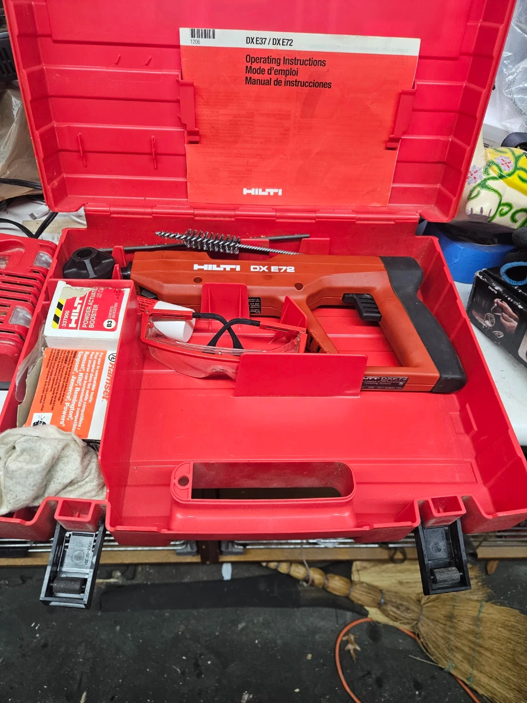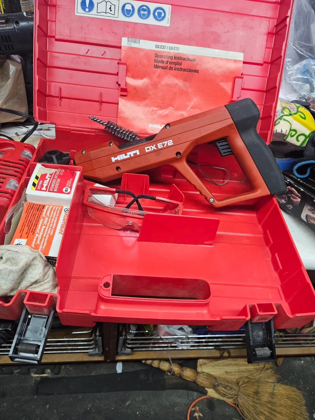 This is a Hilti DX E72 powder actuated tool. It includes safety glasses and operating instructions. The tool comes in its original red Hilti case.