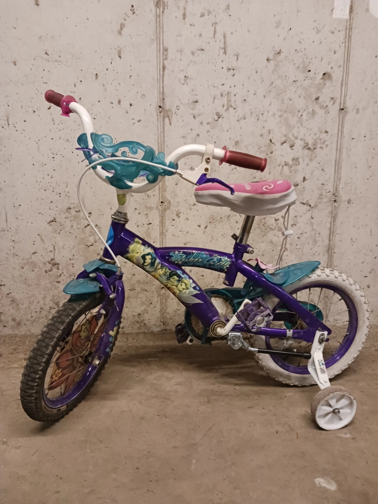 Giving away a cute Disney themed (Tinker Bell) kids' bike! It features a purple and teal colour scheme graphics. Perfect for a little one learning to ride. 13 inch wheels. Training wheels included.