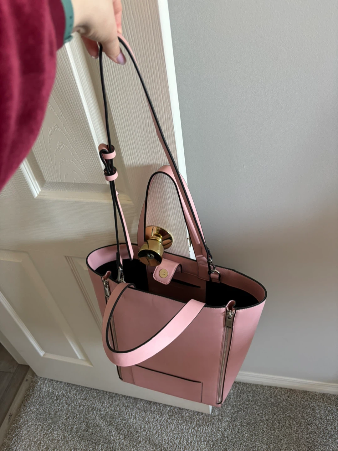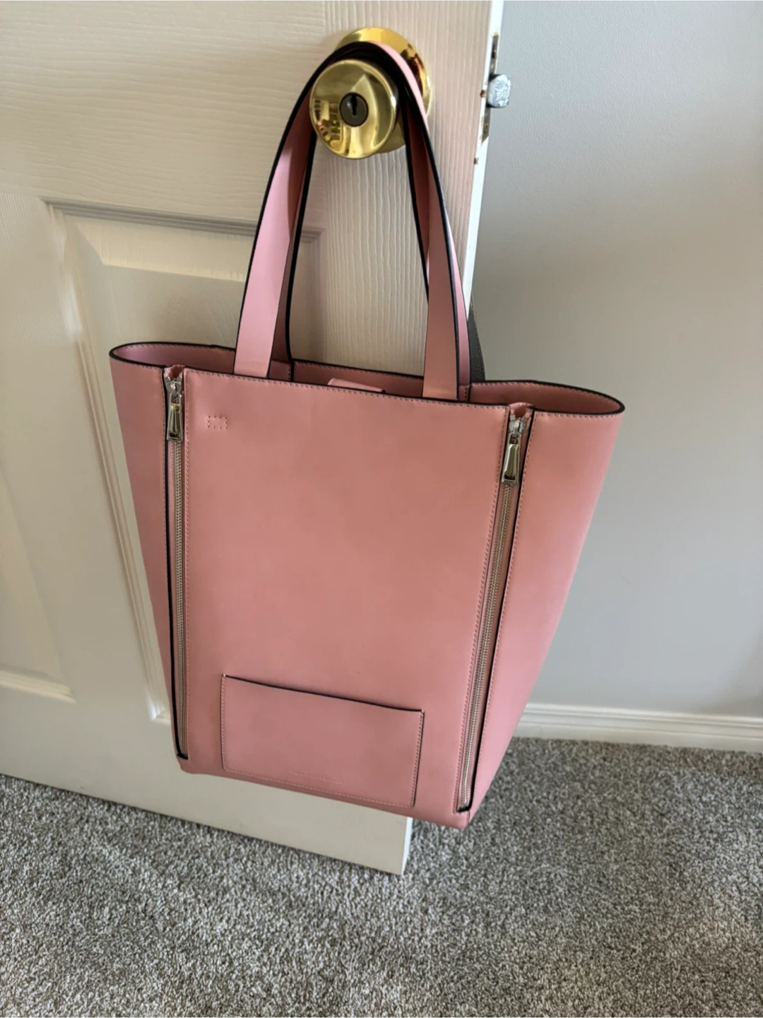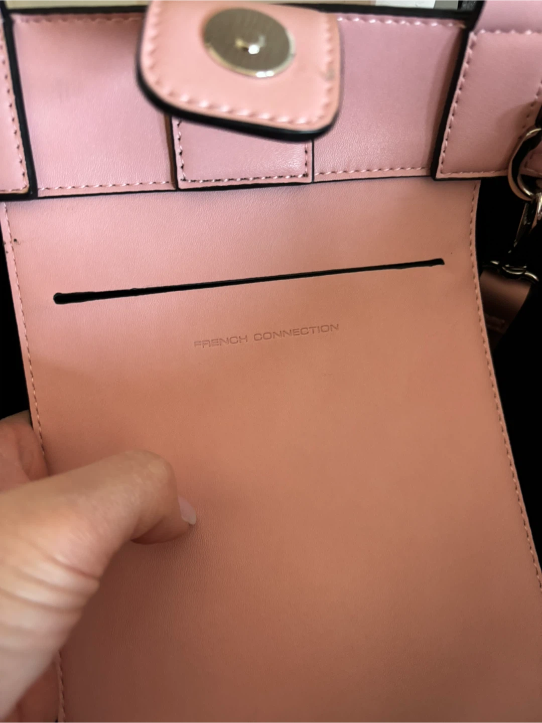 This is a pink tote bag by French Connection. It features zippered side pockets and a front pocket. It's a stylish bag for everyday use!