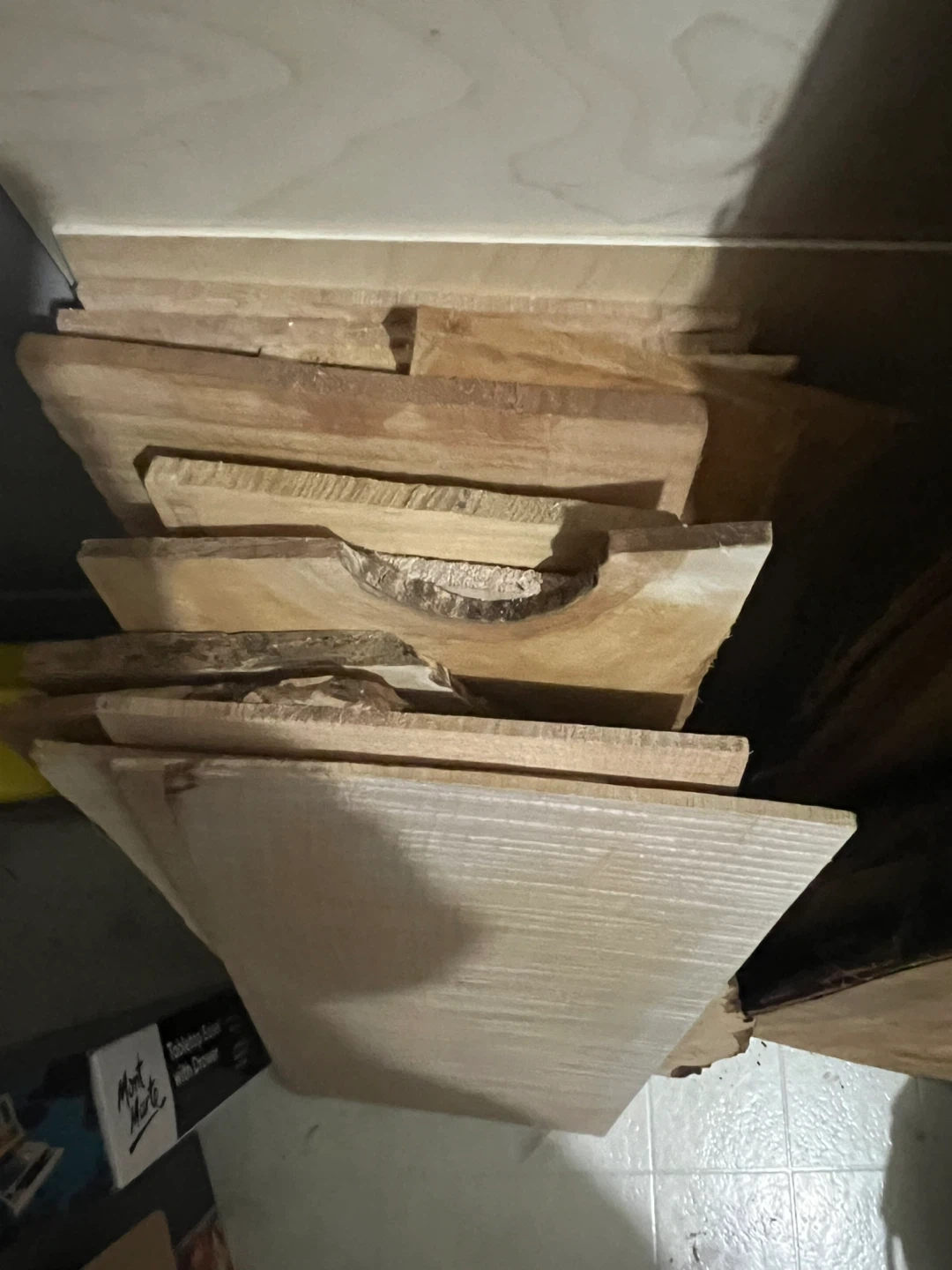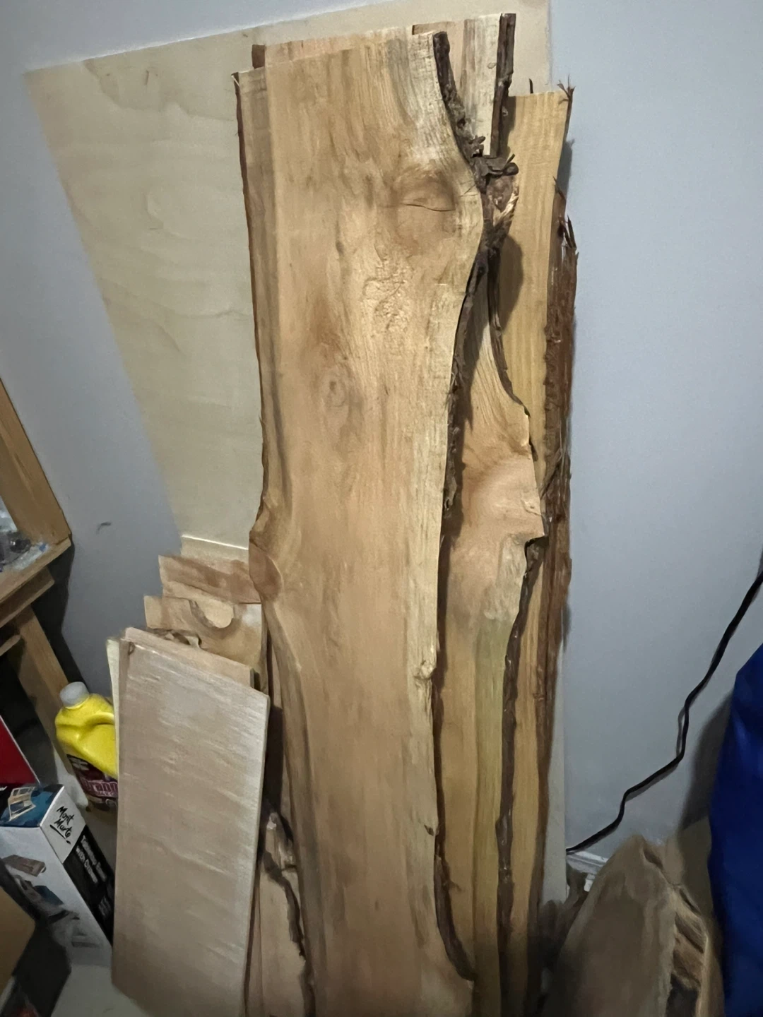 Assorted live edge wood slabs for woodworking projects. Various sizes and natural wood grain patterns. Wood type not specified.