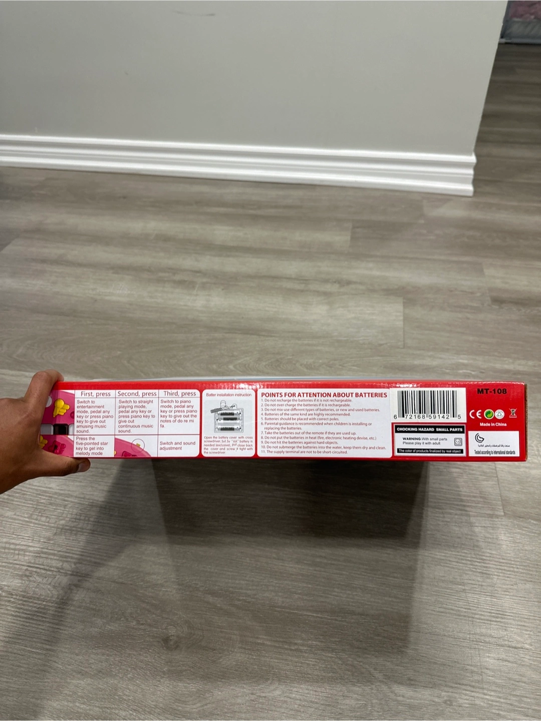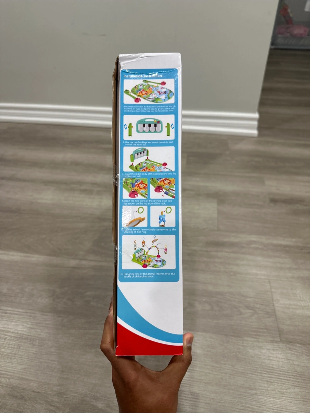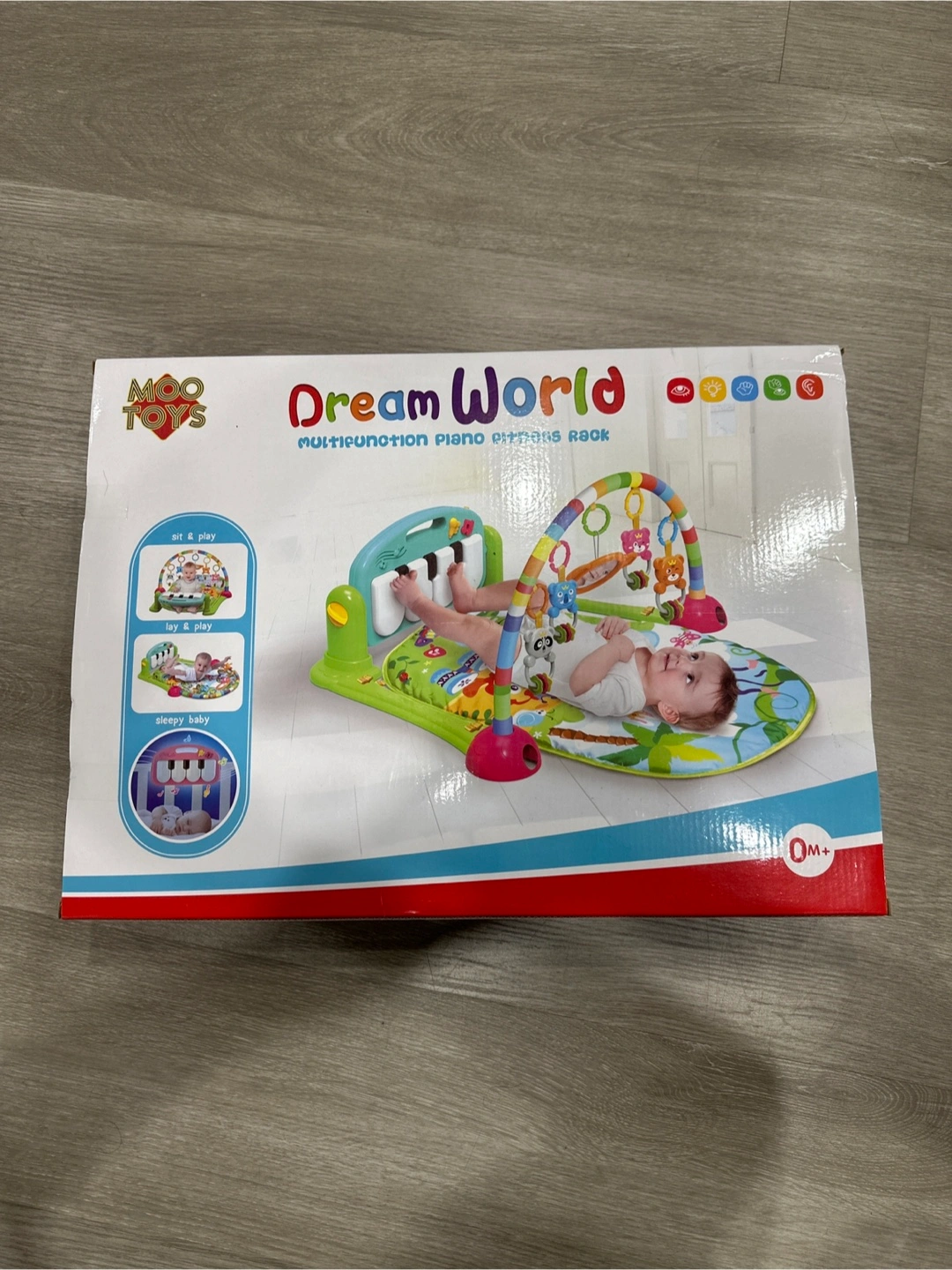It's suitable for babies from 0 months and up. This toy helps develop colour recognition, musical skills, and hand-eye coordination as babies can sit and play with the piano, mirror, and hanging toys.