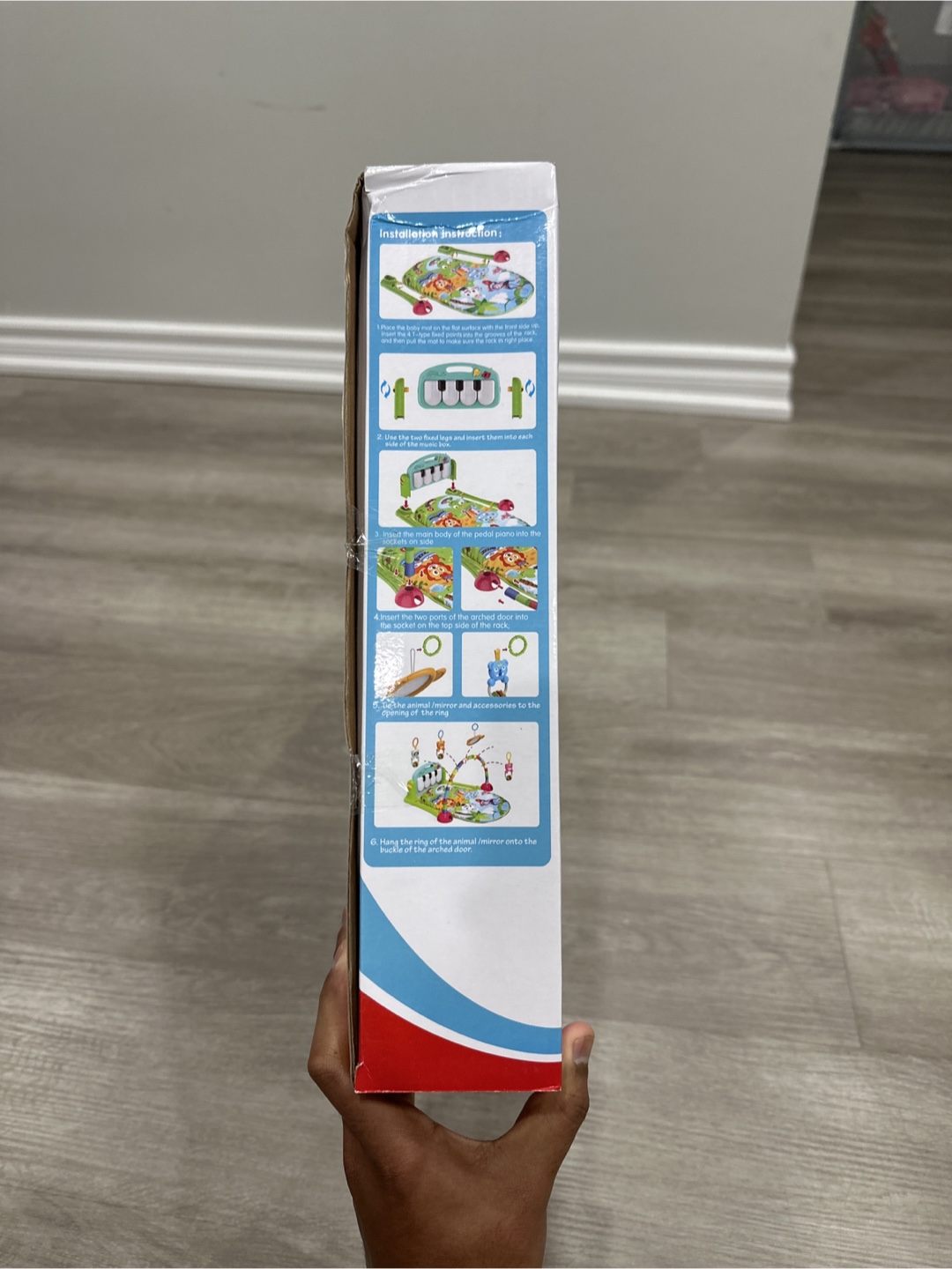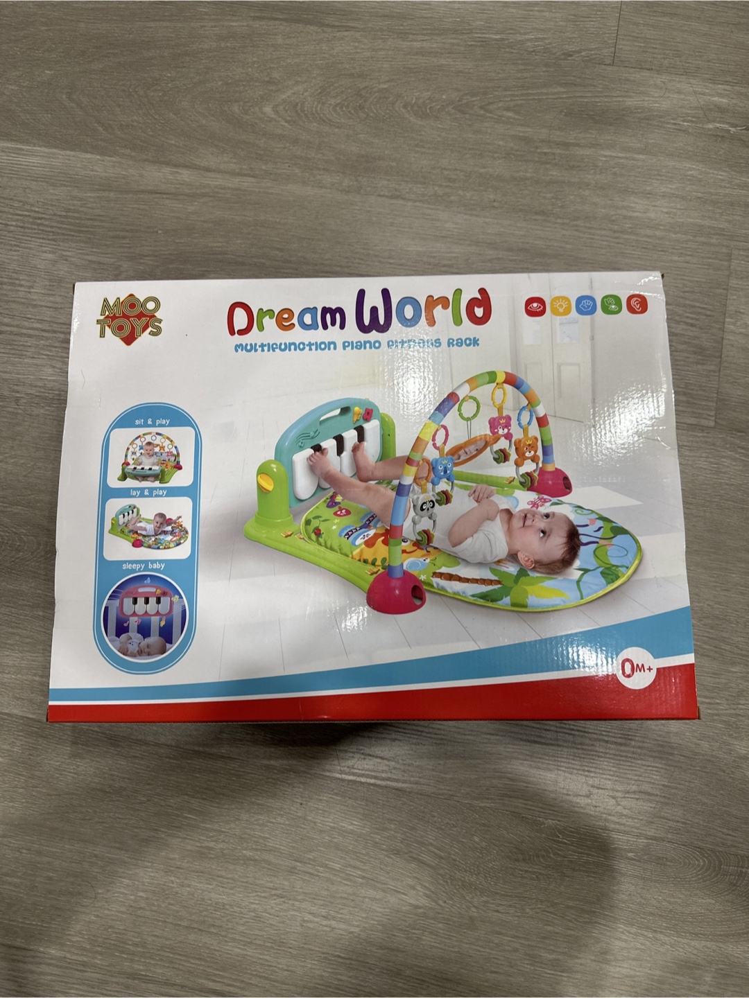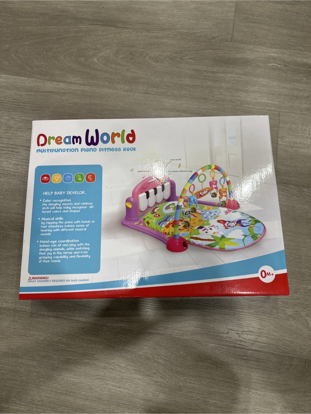 It's suitable for babies from 0 months and up. This toy helps develop colour recognition, musical skills, and hand-eye coordination as babies can sit and play with the piano, mirror, and hanging toys.