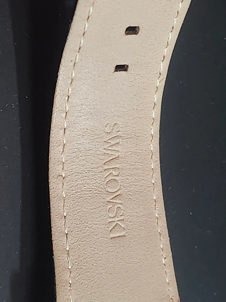 Elegant Swarovski watch. Special Edition model. Swiss made. Black leather band. Stainless steel case. Features crystals.