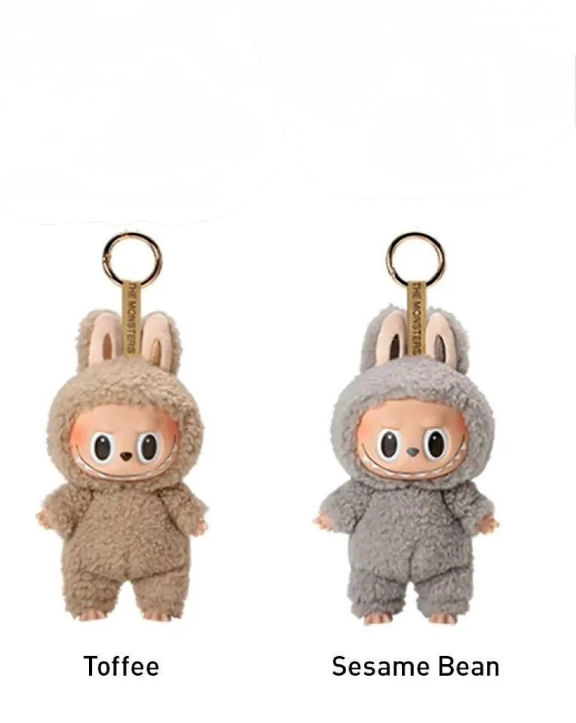 This is a cute plush keychain featuring a character from The Monsters series. It's made of soft, fuzzy material and comes with a keyring attachment. Available in 'Toffee' or 'Sesame Bean' colourways.