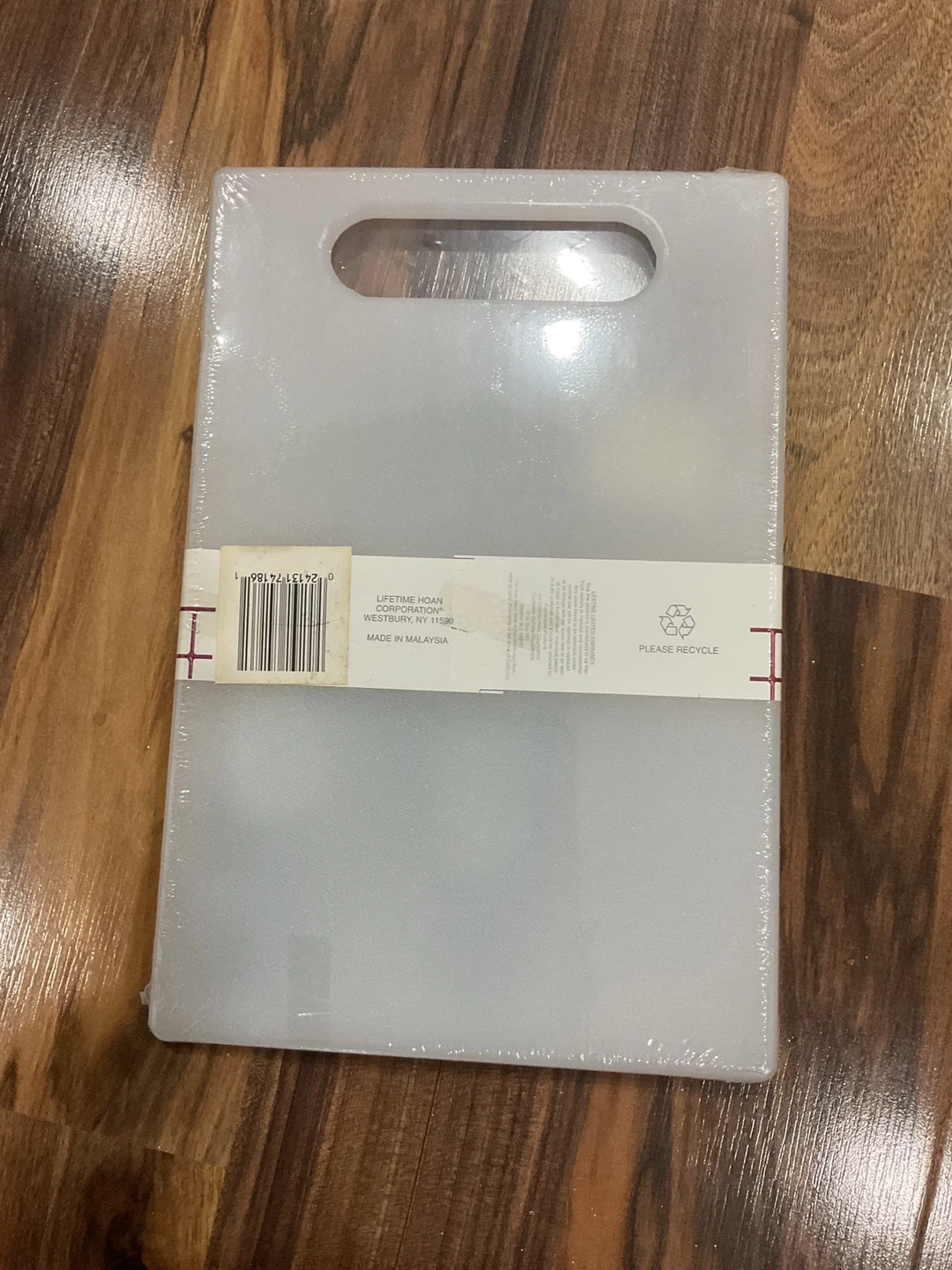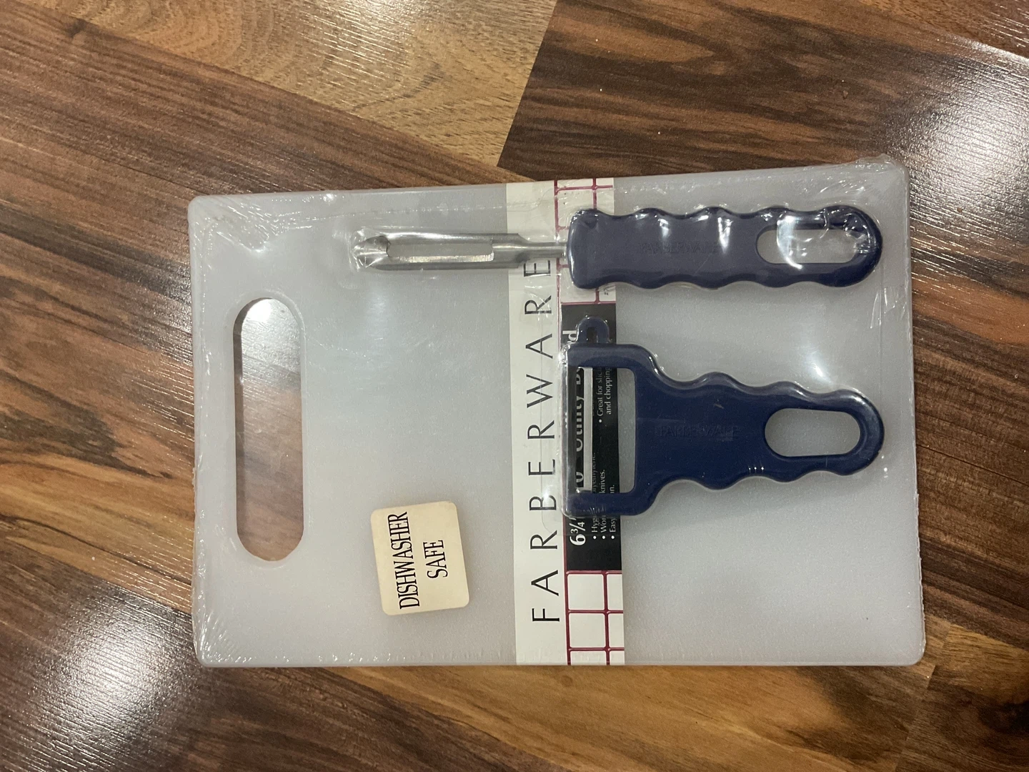 This Farberware cutting board is dishwasher safe. It comes with two peelers that have navy blue handles. Made in Malaysia. Sealed in its original packaging. Never opened.