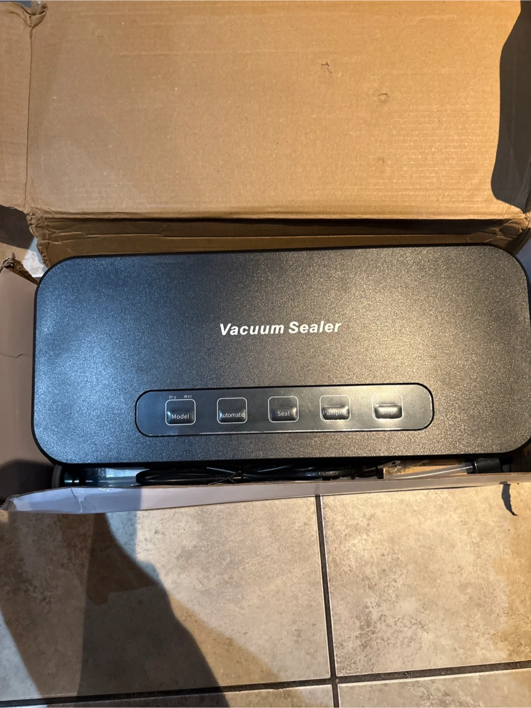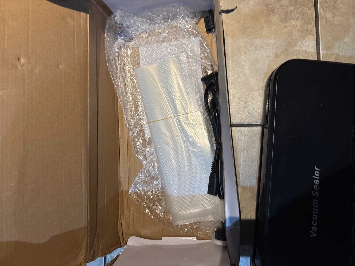 Vacuum sealer machine with included bag rolls. Unit is black and comes in original packaging. This device is for keeping food fresh by removing air and sealing it tightly.