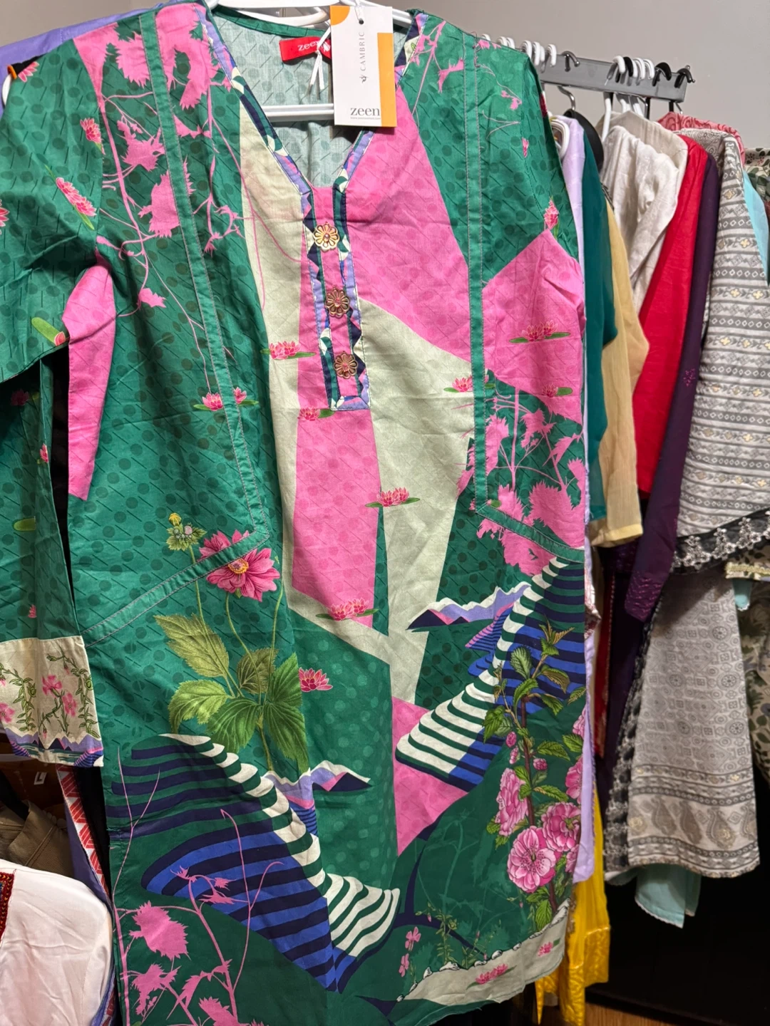 This ZEEN kurti features a vibrant green base with a bold geometric and floral print in pinks and blues. It's a stylish cambric fabric top. A great piece for casual wear!