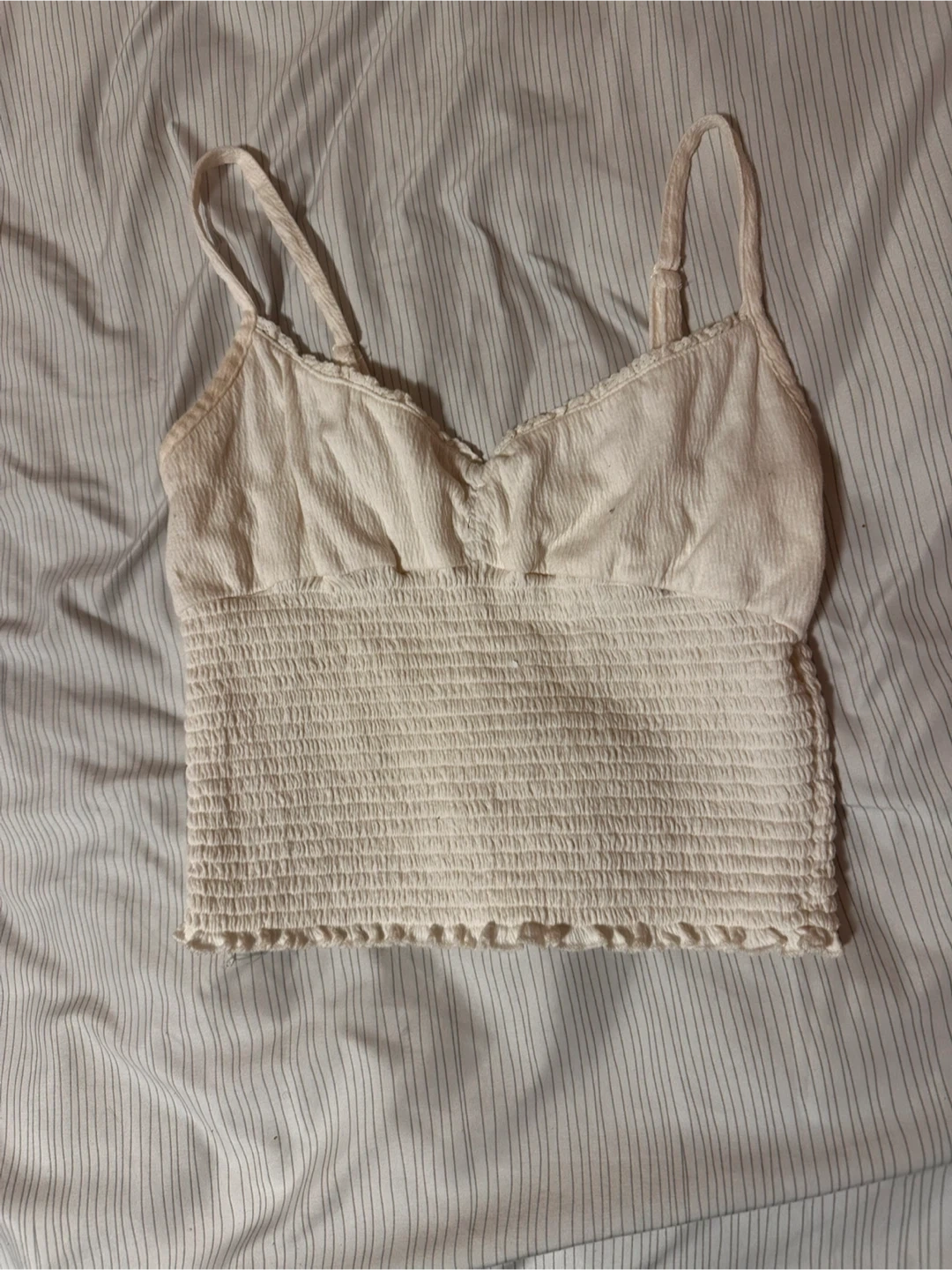 This cream No Boundaries smocked cami top is a size Large (12-14). It's made from 54% cotton, 40% recycled polyester, 5% nylon, and 1% spandex. This top is perfect for warm weather days!
