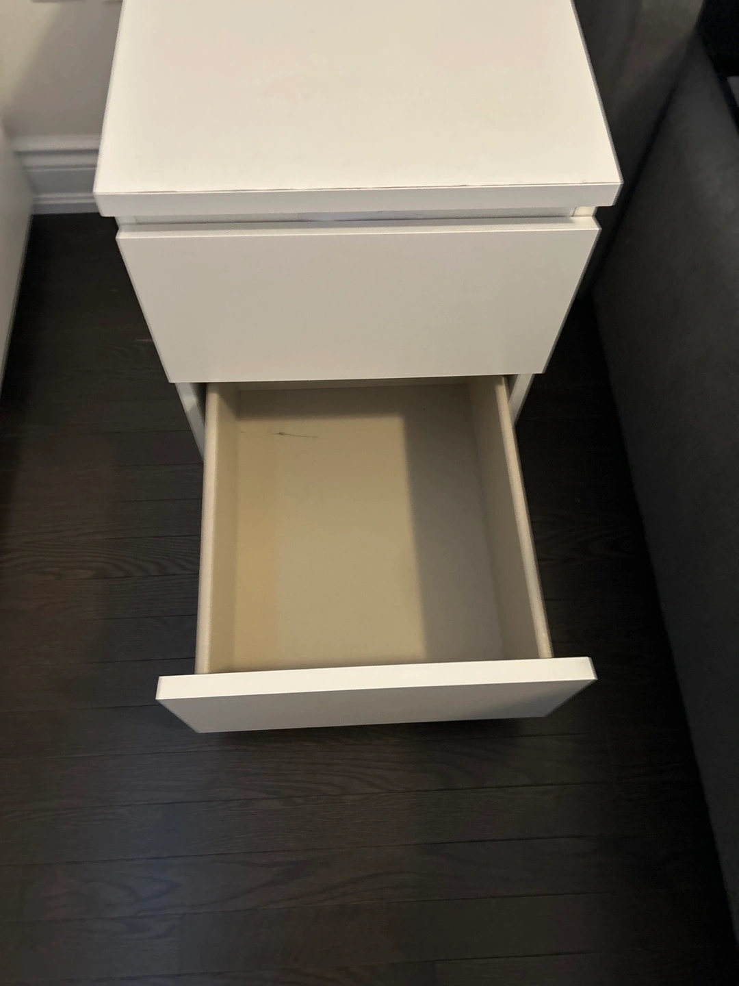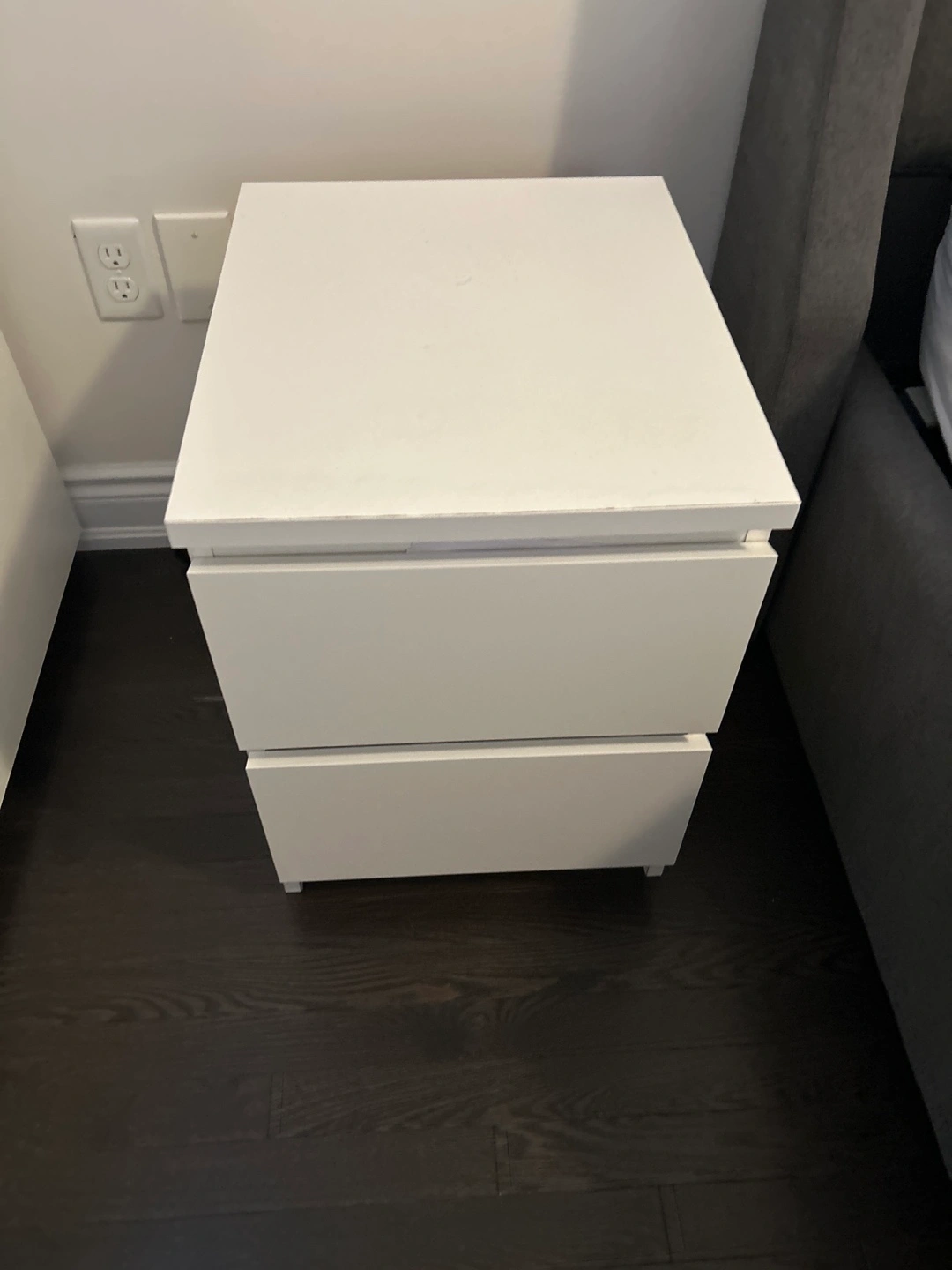 White nightstand with 2 drawers.