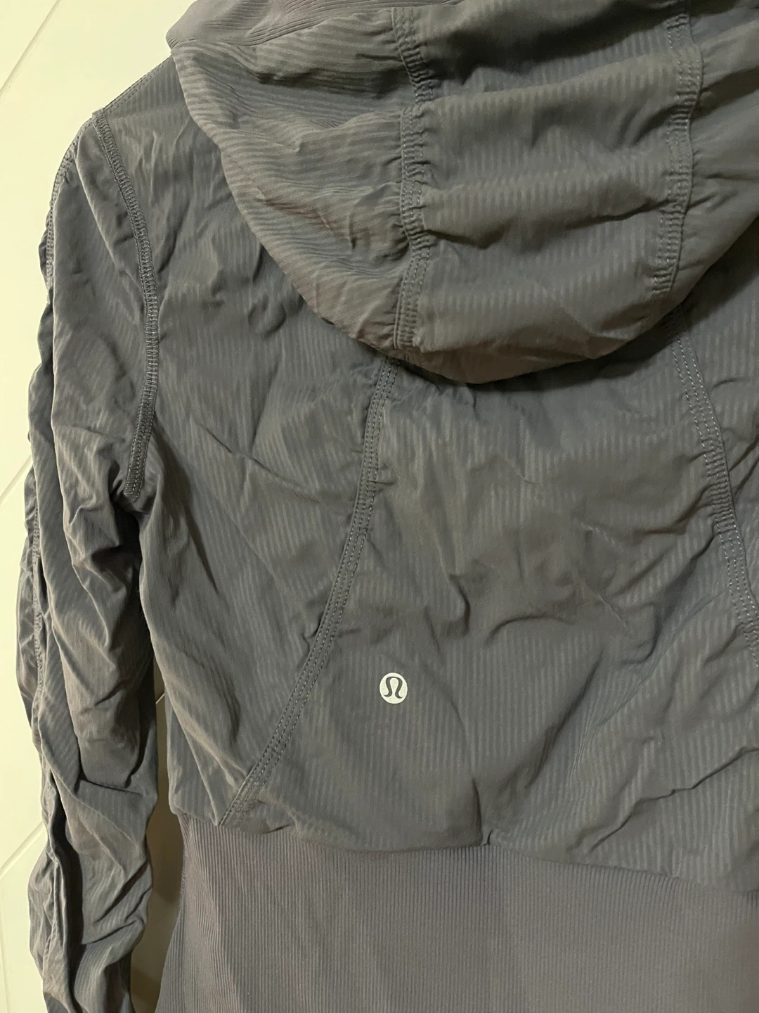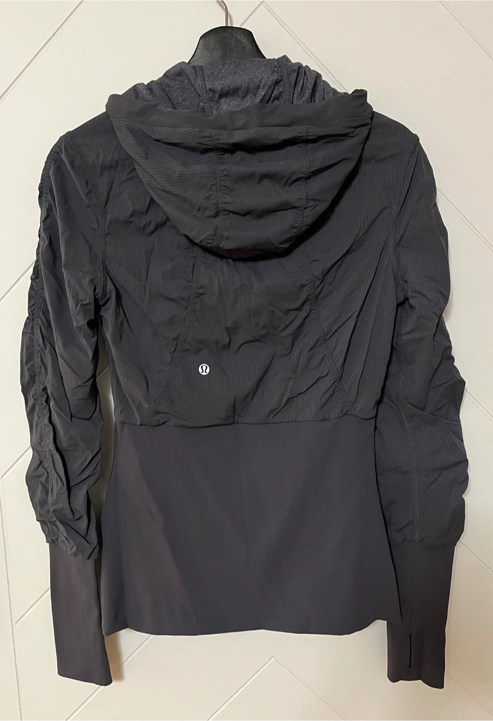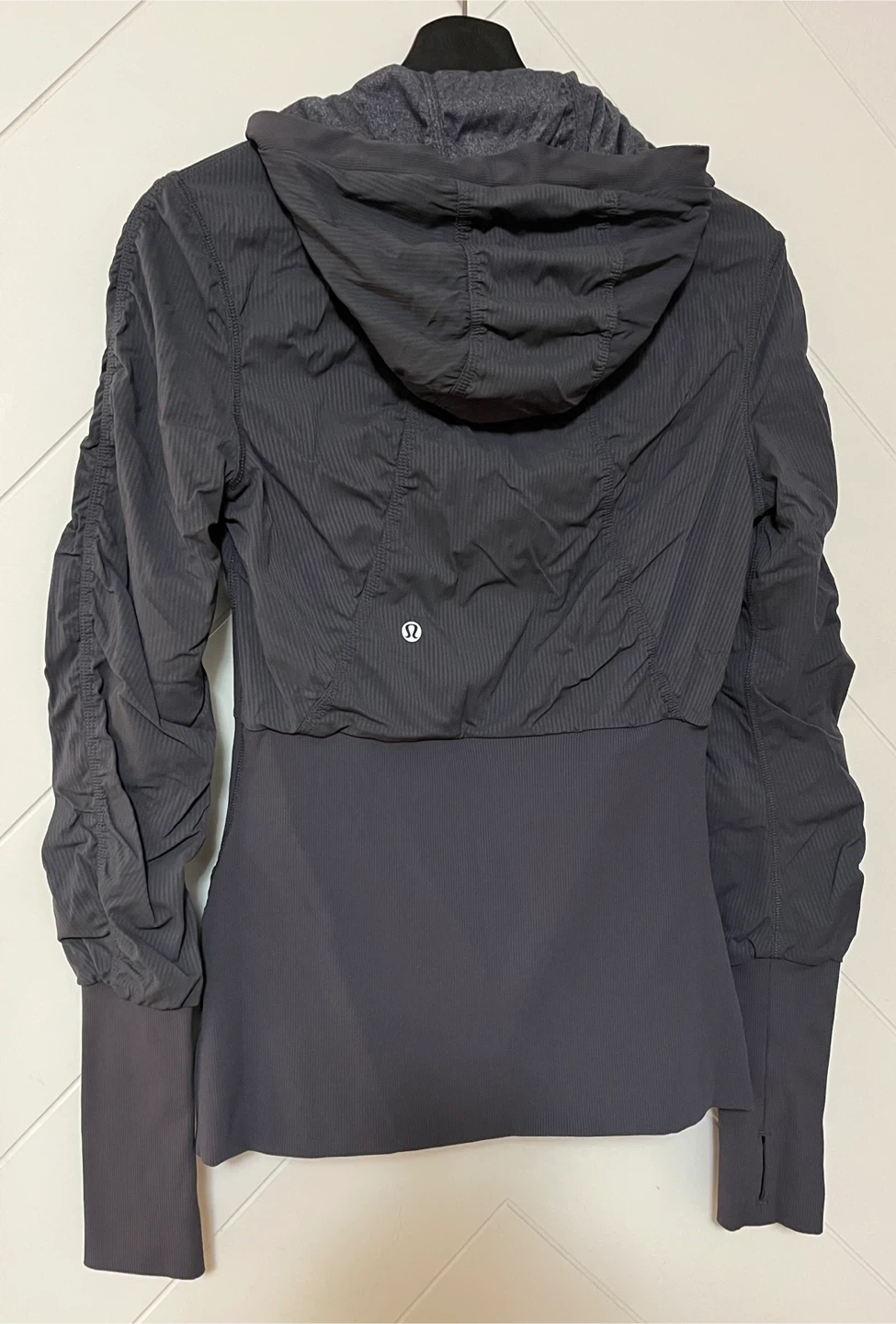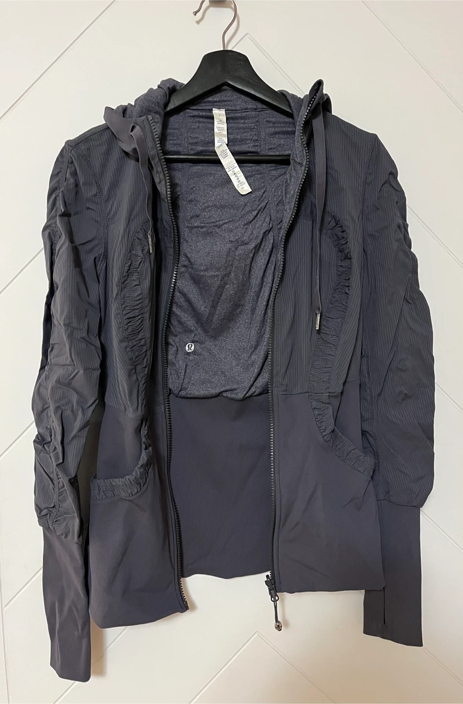 Lululemon reversible hooded jacket in a dark grey colour, full zip closure and ruched detailing on the sleeves and front