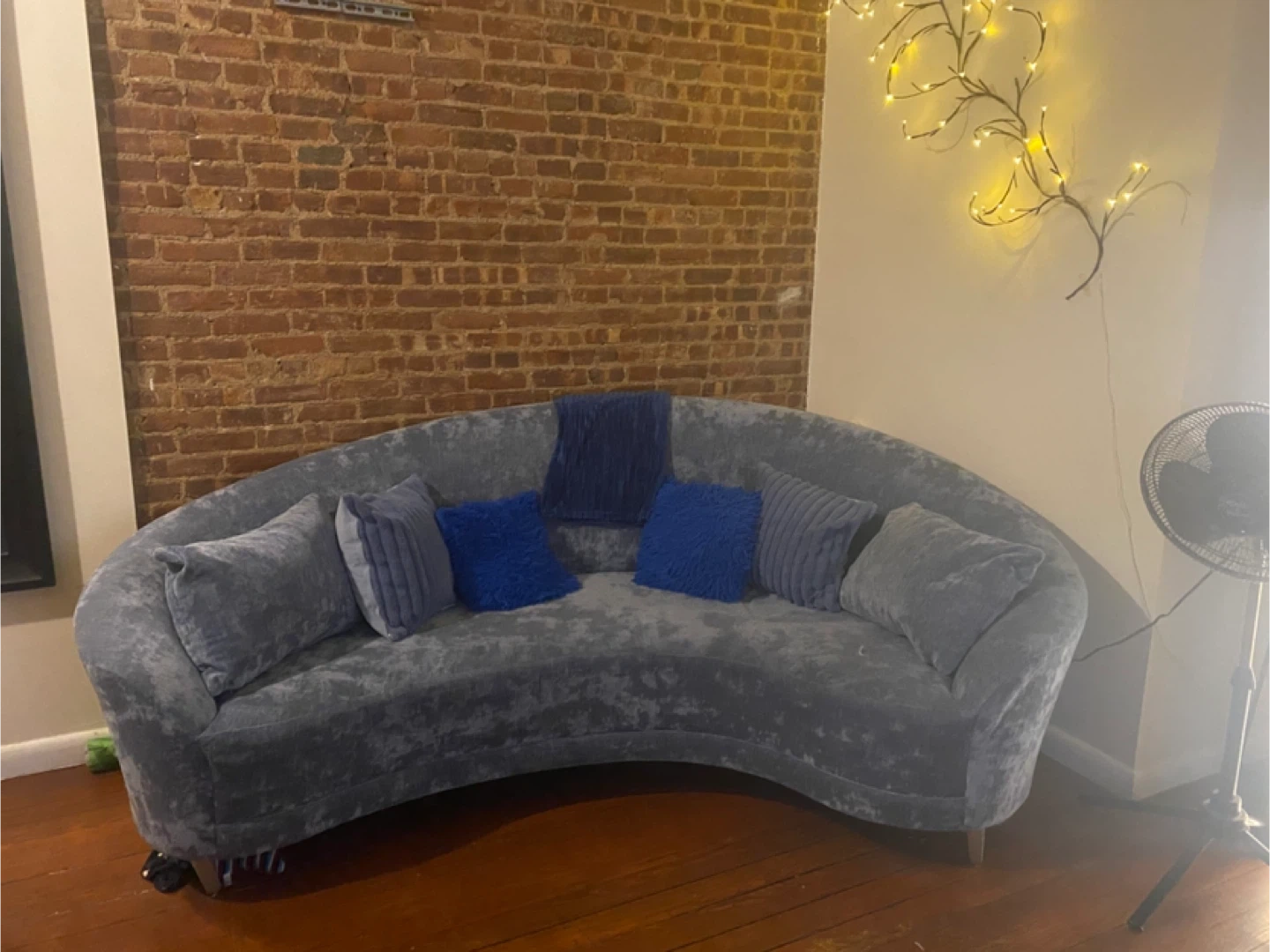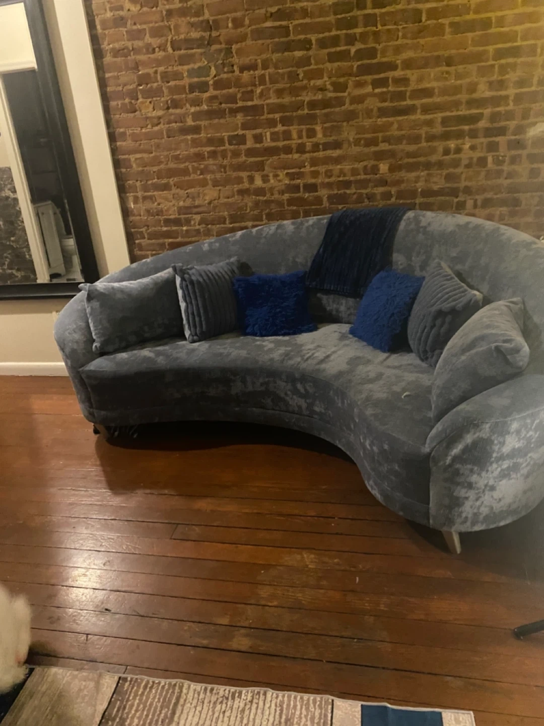 Selling a curved sofa in a gray color. It has a unique design and comes with several throw pillows in varying shades of blue and gray. The sofa would be a great addition to any living room or seating area!