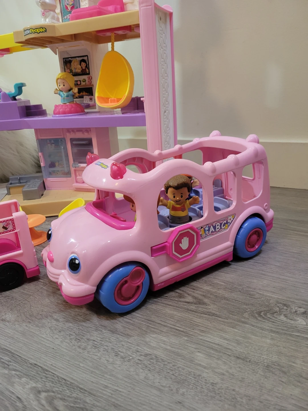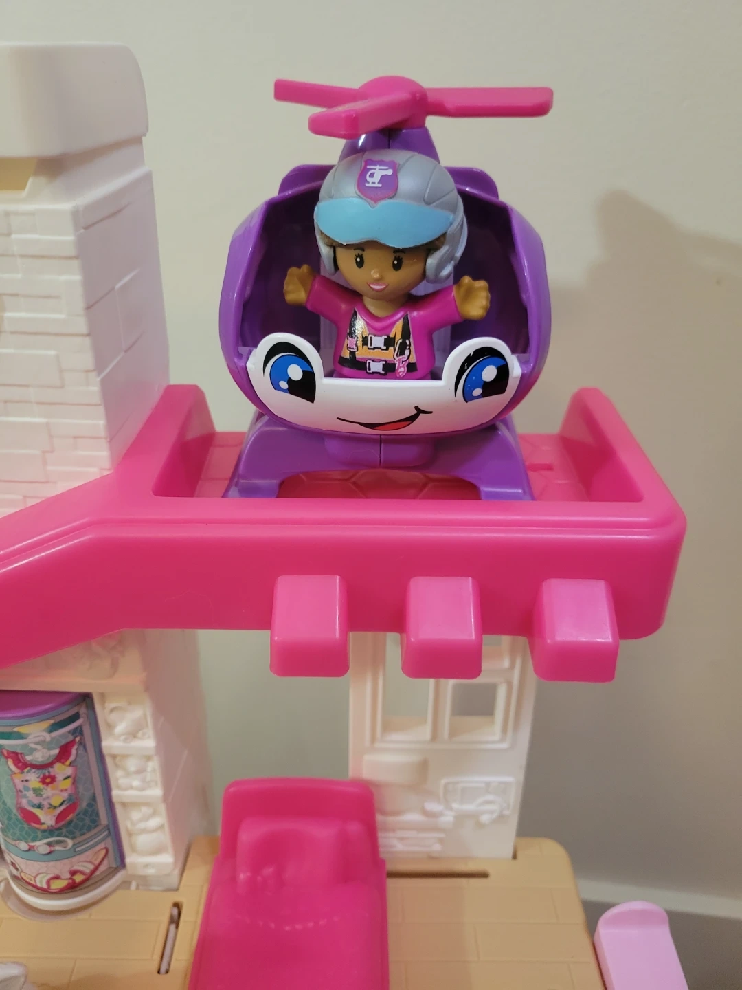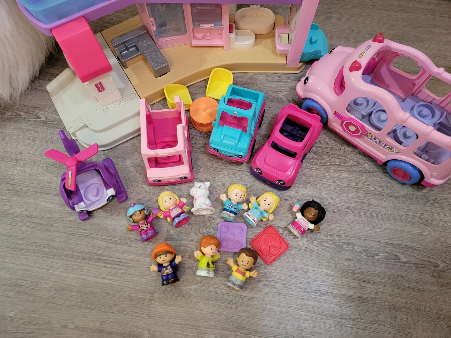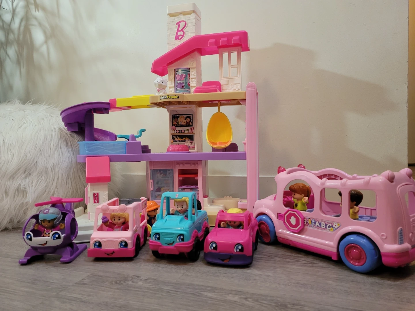 Fisher-Price Little People set features the Barbie Dreamhouse with multiple levels and accessories, including a pink car, a blue truck, a pink bus, a pink ice cream truck and a purple helicopter. It comes with several Little People figures. This playset is great for imaginative play!