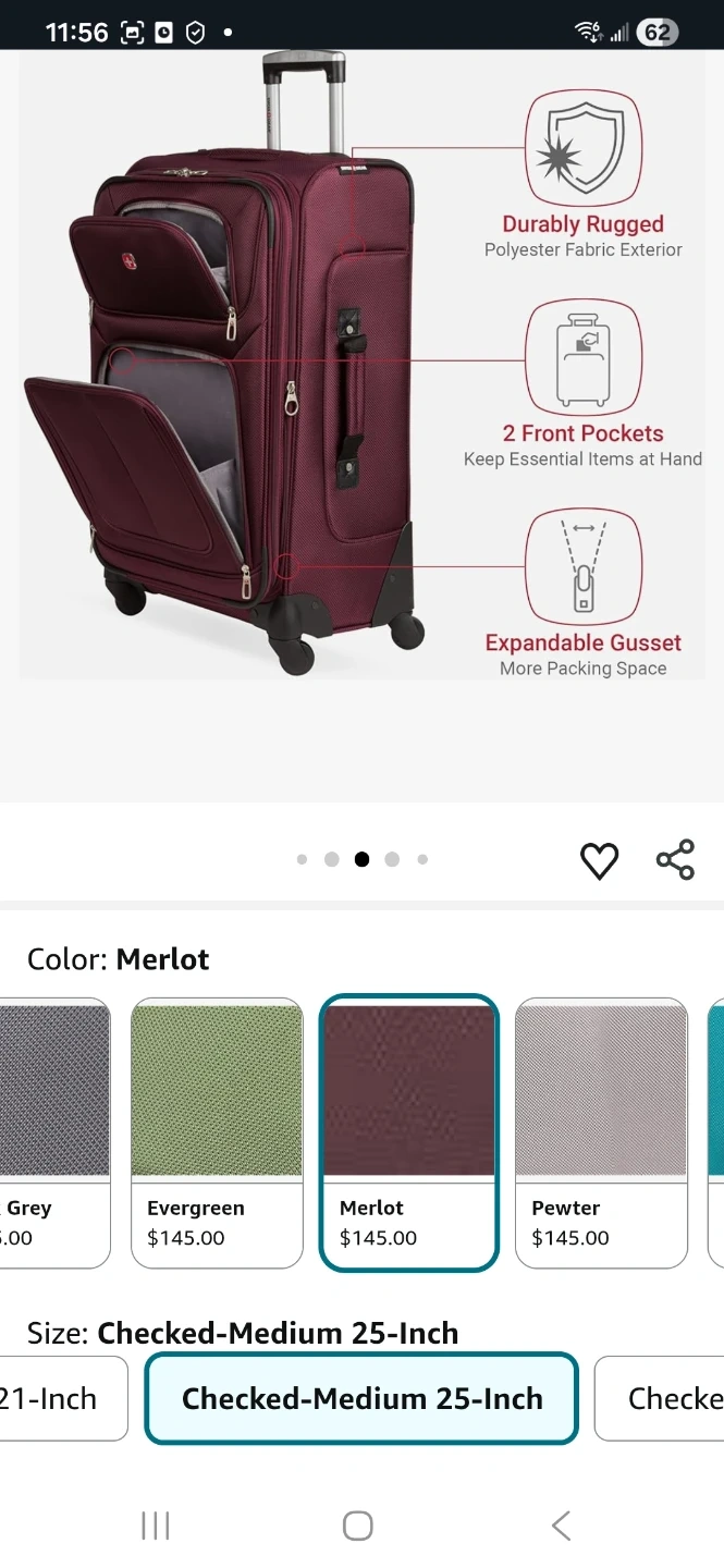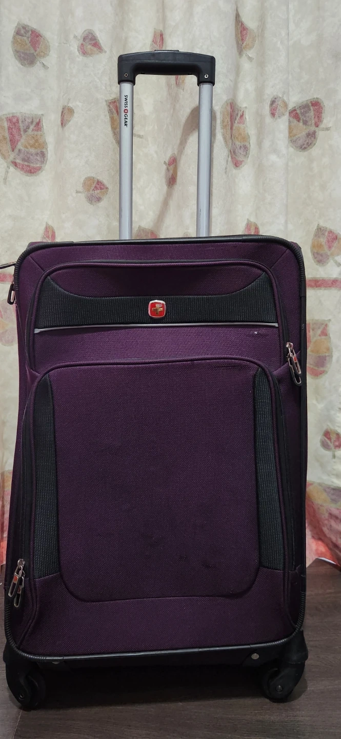 This is a rolling suitcase from Swiss Gear. It's purple and has a retractable handle. The suitcase is made of durable fabric and has spinner wheels for easy maneuverability. Measures approximately 16 inches in width and 25 inches in length.