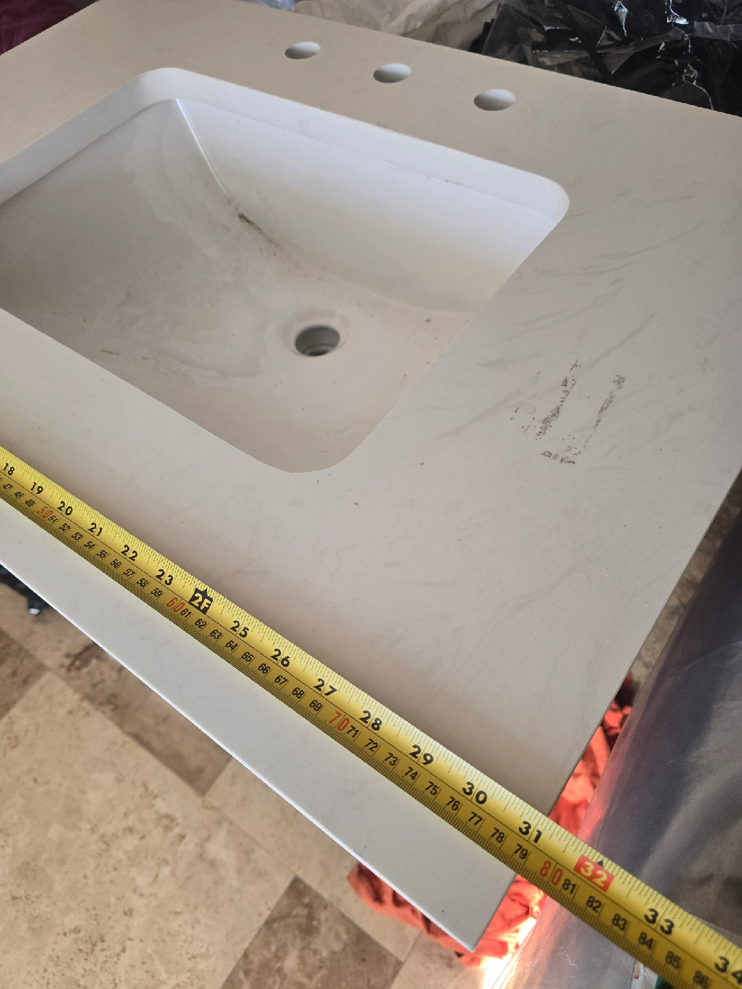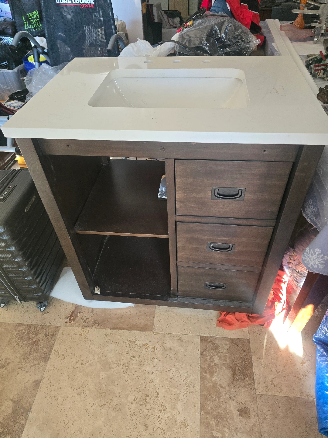 Selling a bathroom vanity with a sink. it has stone countertop and Dimensions are approximately 35 inches in height and 31 inches in width x 22 deep.with 3 drawers.