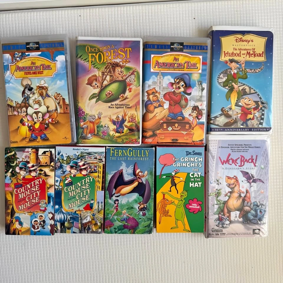 Classic animated movies on VHS! Got this fun lot of 9 tapes. Includes both An American Tail movies (Fievel Goes West and the original), Disney's The Adventures of Ichabod and Mr. Toad, Once Upon a Forest, Ferngully: The Last Rainforest, Dr. Seuss The Cat in the Hat & Grinches, We're Back! A Dinosaur's Story, and two The Country Mouse and the City Mouse Adventures tapes. Great for nostalgia or for the kids! $20 for all or $3 each.
