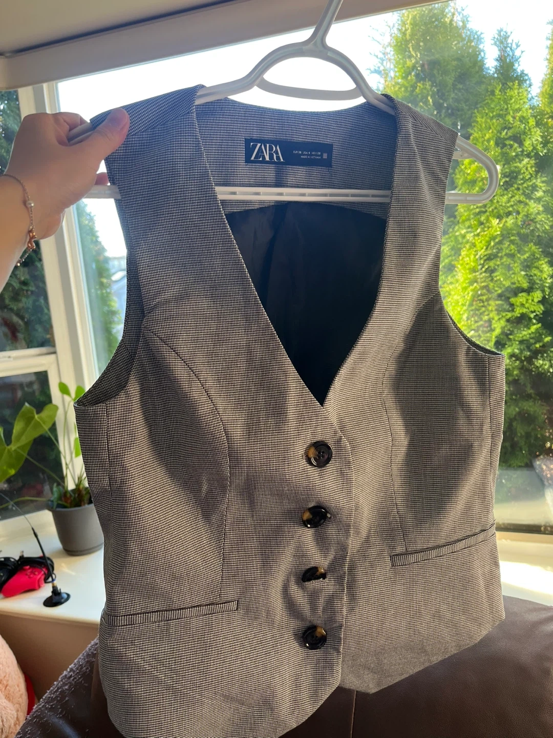 Buy & SellZara Houndstooth Vest - Size SmallZara Houndstooth Vest - Size Small$14Can fit S/MConditionLike newSizeSBrandZaraWHERE TO MEETCheck LocationView MapSELLERverifiedMina HoangEast Vancouver650 reviews0 chats·0 favorites·6 viewsSEND CHAT TO SELLERHi Mina Hoang! I’m interested in your listing.Hi Mina Hoang! I’m interested in your listing.Get the Karrot app to chatSign In to chat