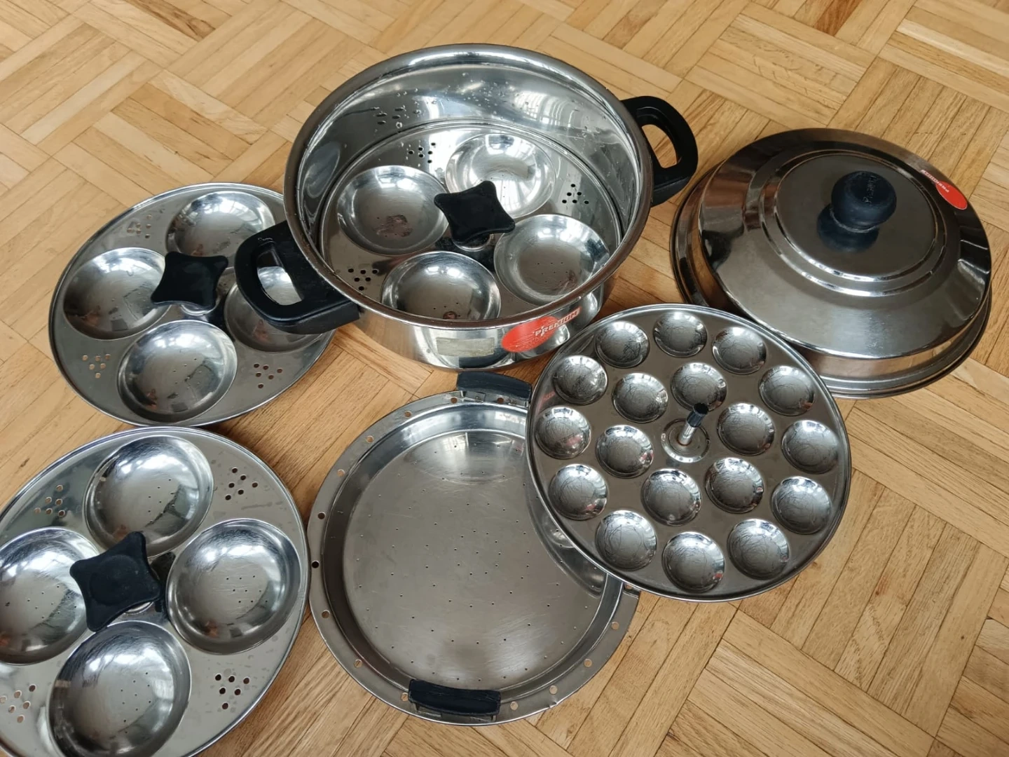 This stainless steel idli maker comes with a pot, steamer, and multiple idli plates. It includes a lid and is made of durable stainless steel. Makes up to 16 idlis at once! Mini idly plate is also included we bought separately.