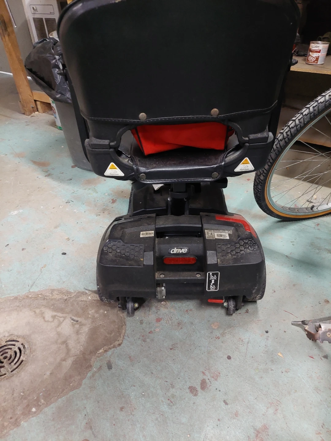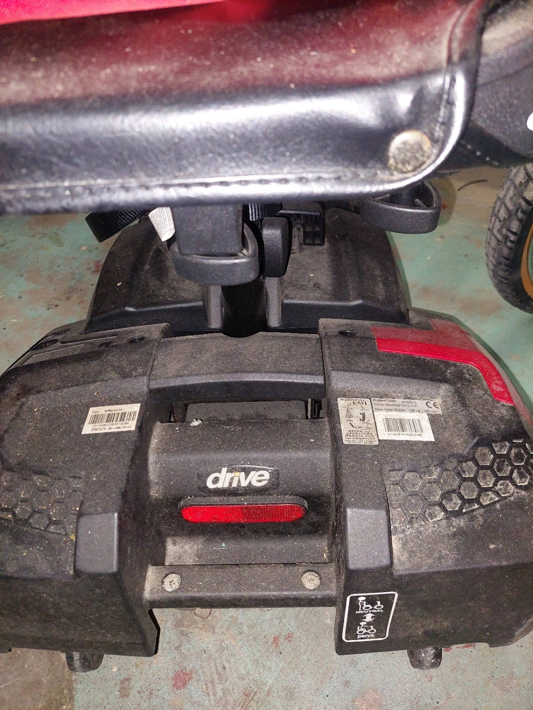 Drive Scout mobility scooter with a comfortable seat. It's black and red with a weight capacity of 250 lbs. This scooter is great for getting around.