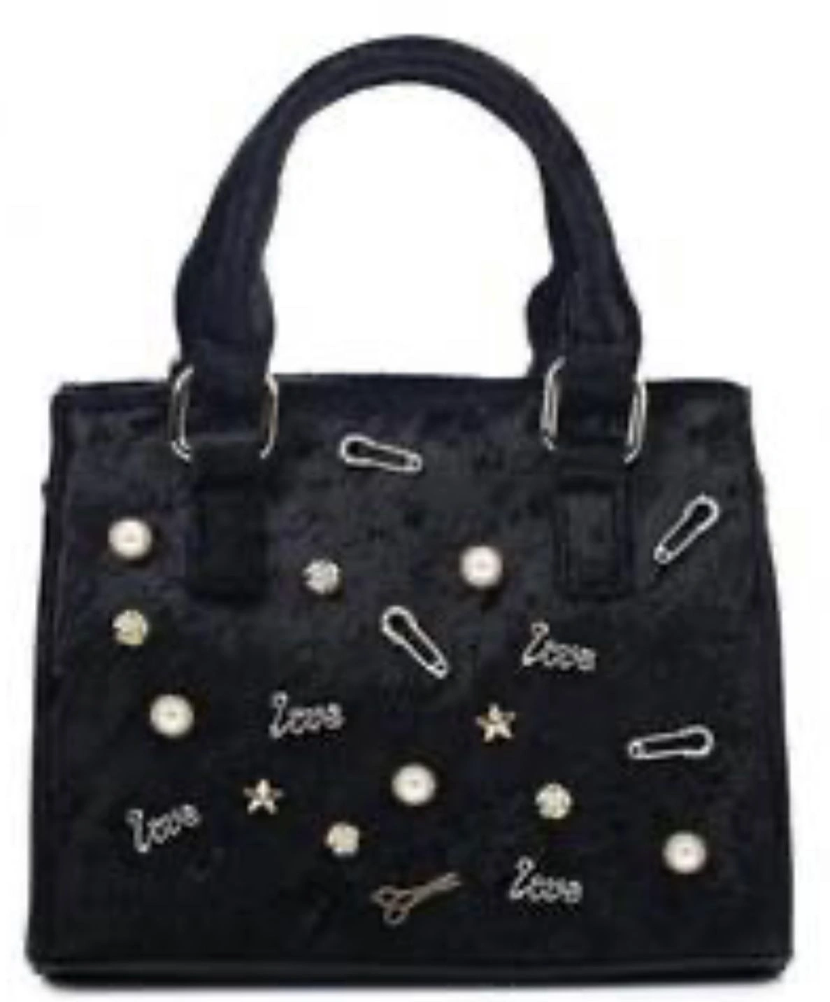 New without tags, never worn! Super cute Call It Spring mini handbag with black velvet texture and embellished details. Gold-tone hardware, pearl accents, star motifs, safety-pin designs, and delicate “love” charms give this bag a fun, edgy-glam vibe—perfect for nights out, parties, and special occasions.