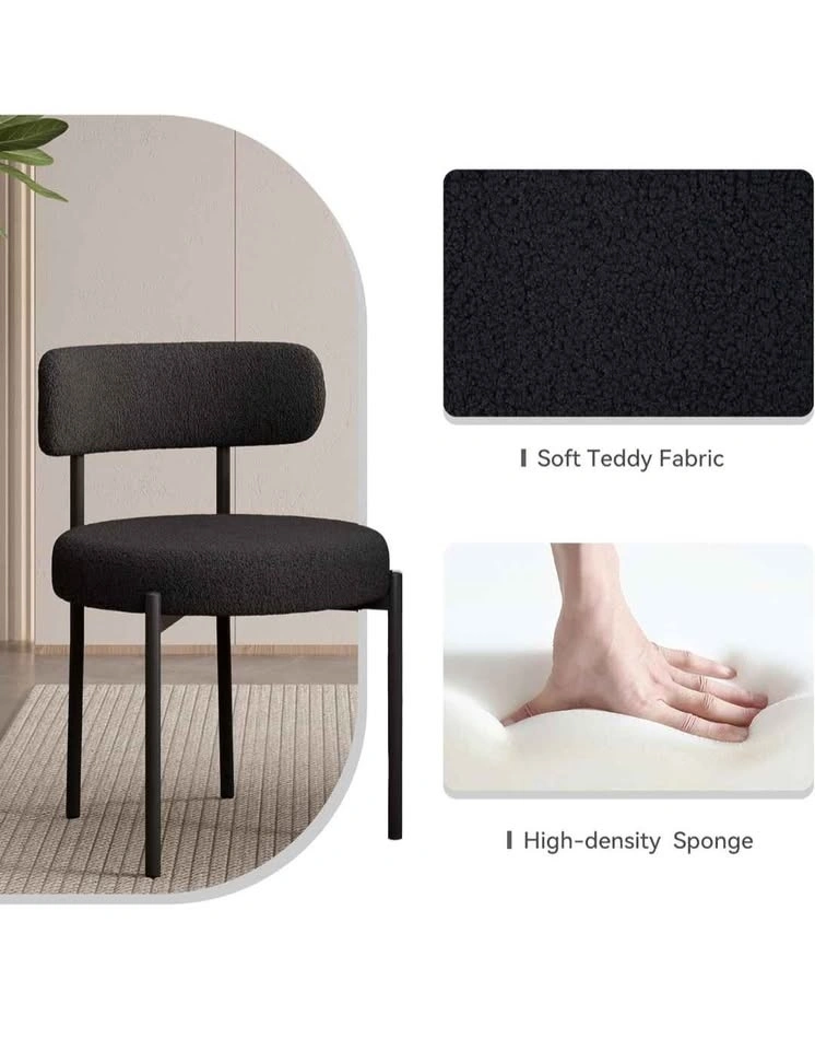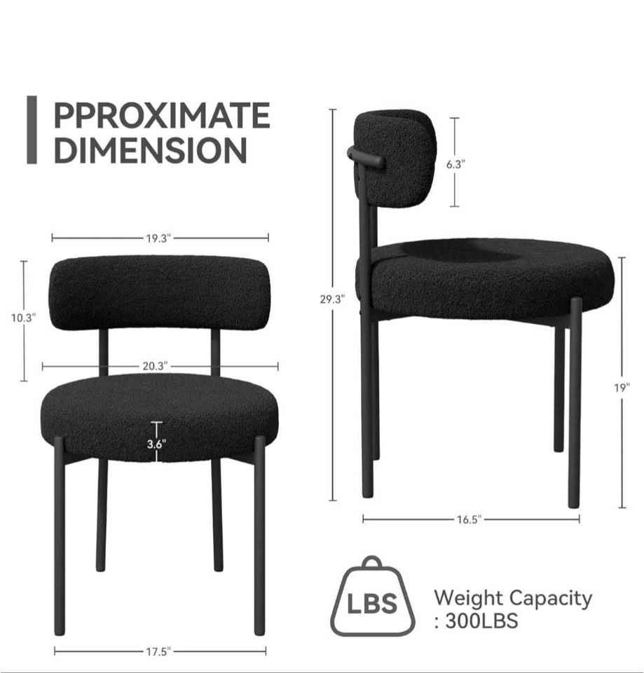 Stylish black teddy fabric chairs, set of 2. Super comfy with high-density sponge. Has sturdy black metal legs. Approximate dimensions: 29.3" total height, seat height 19", seat 20.3" wide x 17.5" deep. Backrest is 10.3" high. Can hold up to 300 LBS. In original box. Original price $181 including tax.