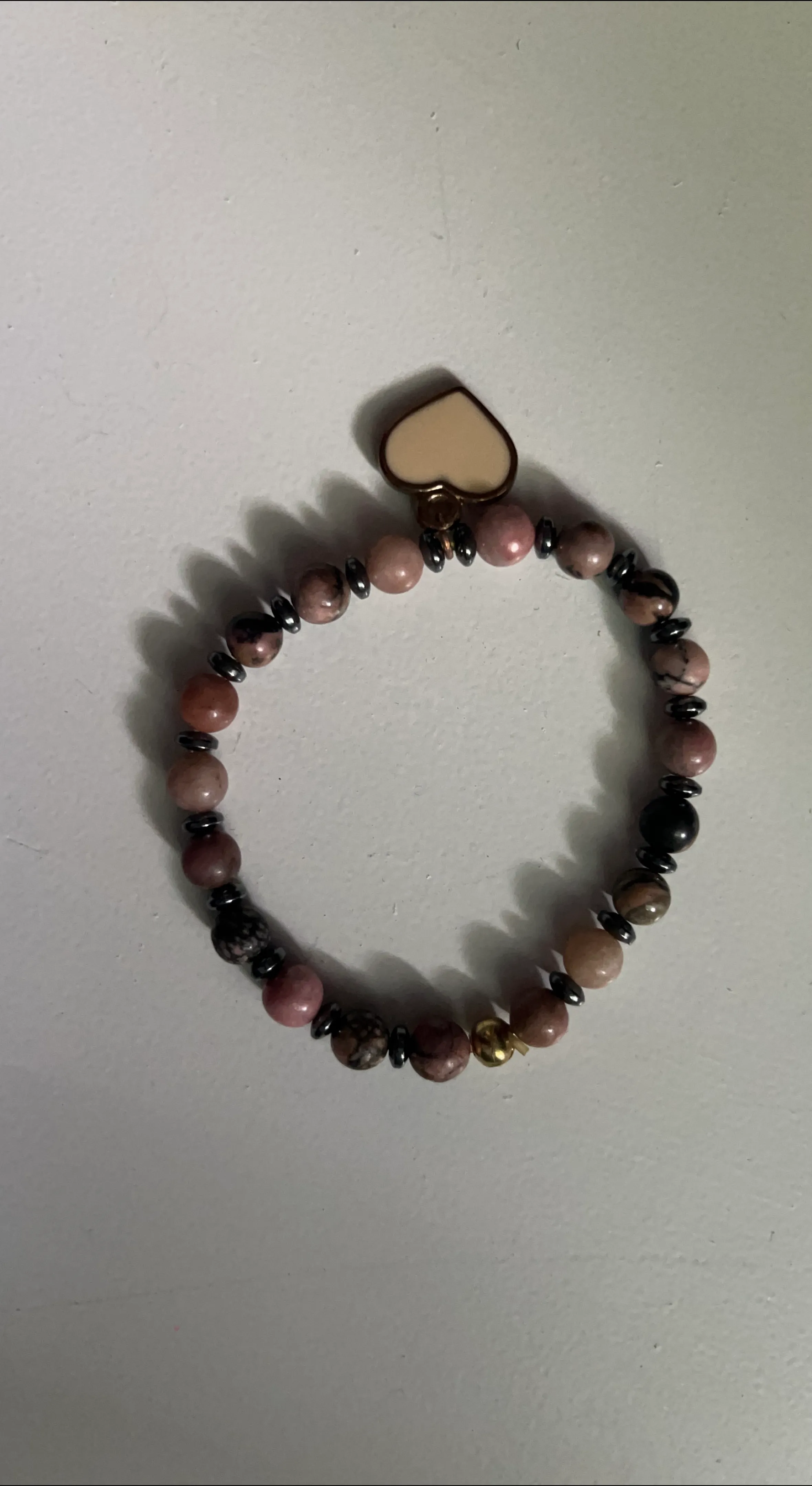 Selling a cute beaded bracelet! It features a mix of pink, black, and gold-toned beads, along with a heart charm. Perfect for adding a little something extra to your outfit