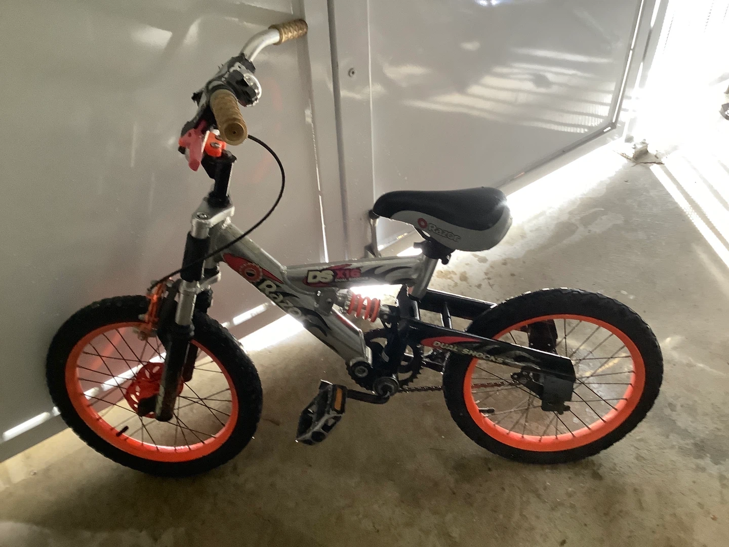 This is a Razor Dual Shocks kids bike. It's silver with orange accents on the rims and handlebars. Features dual suspension for a smoother ride. This bike is suitable for young riders.