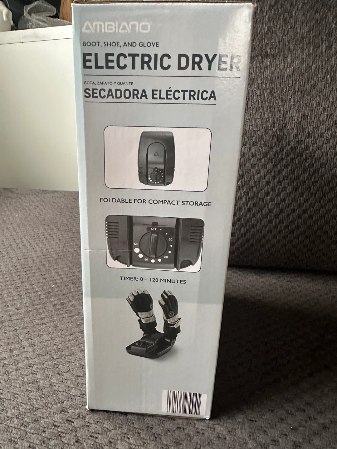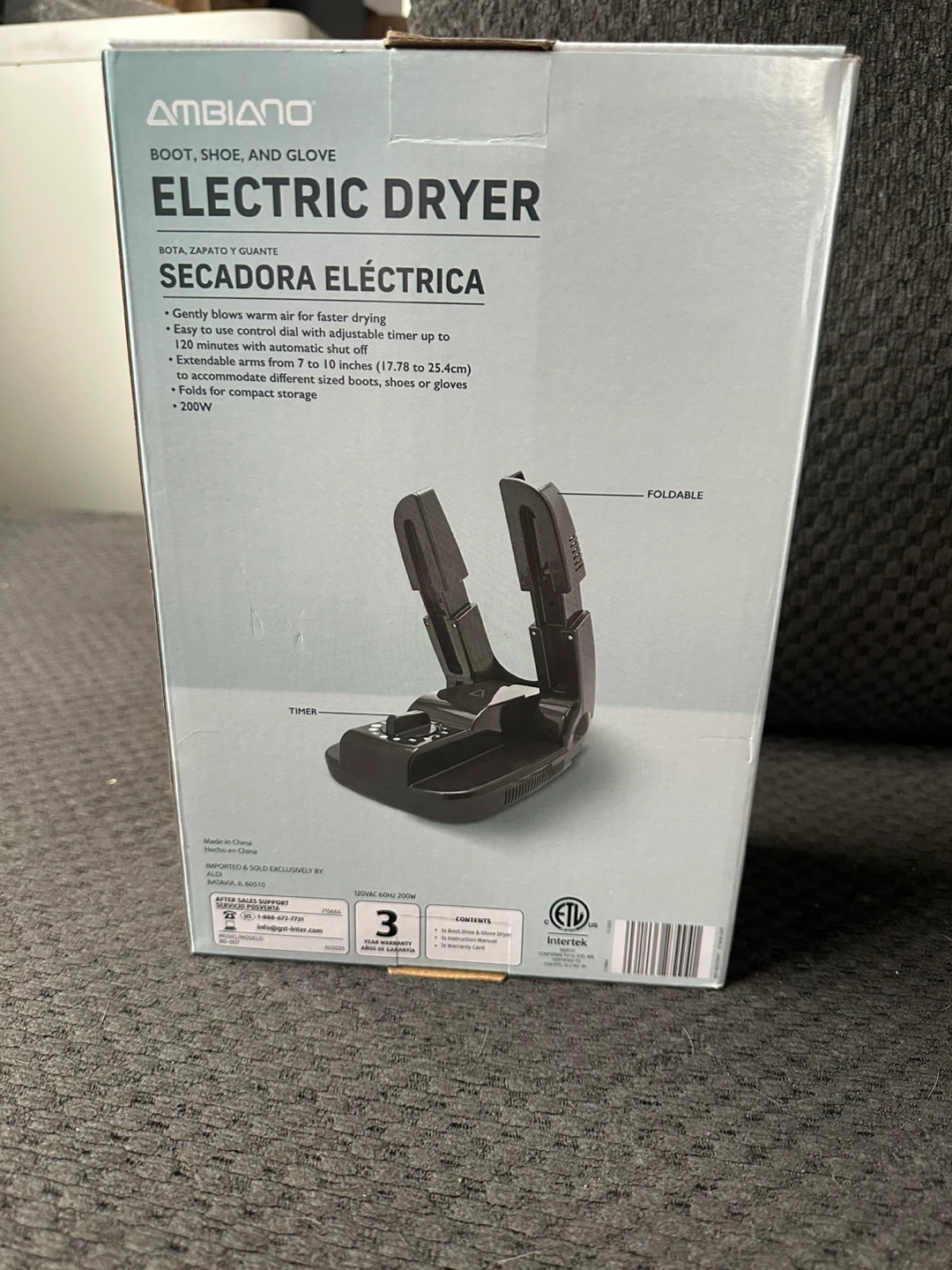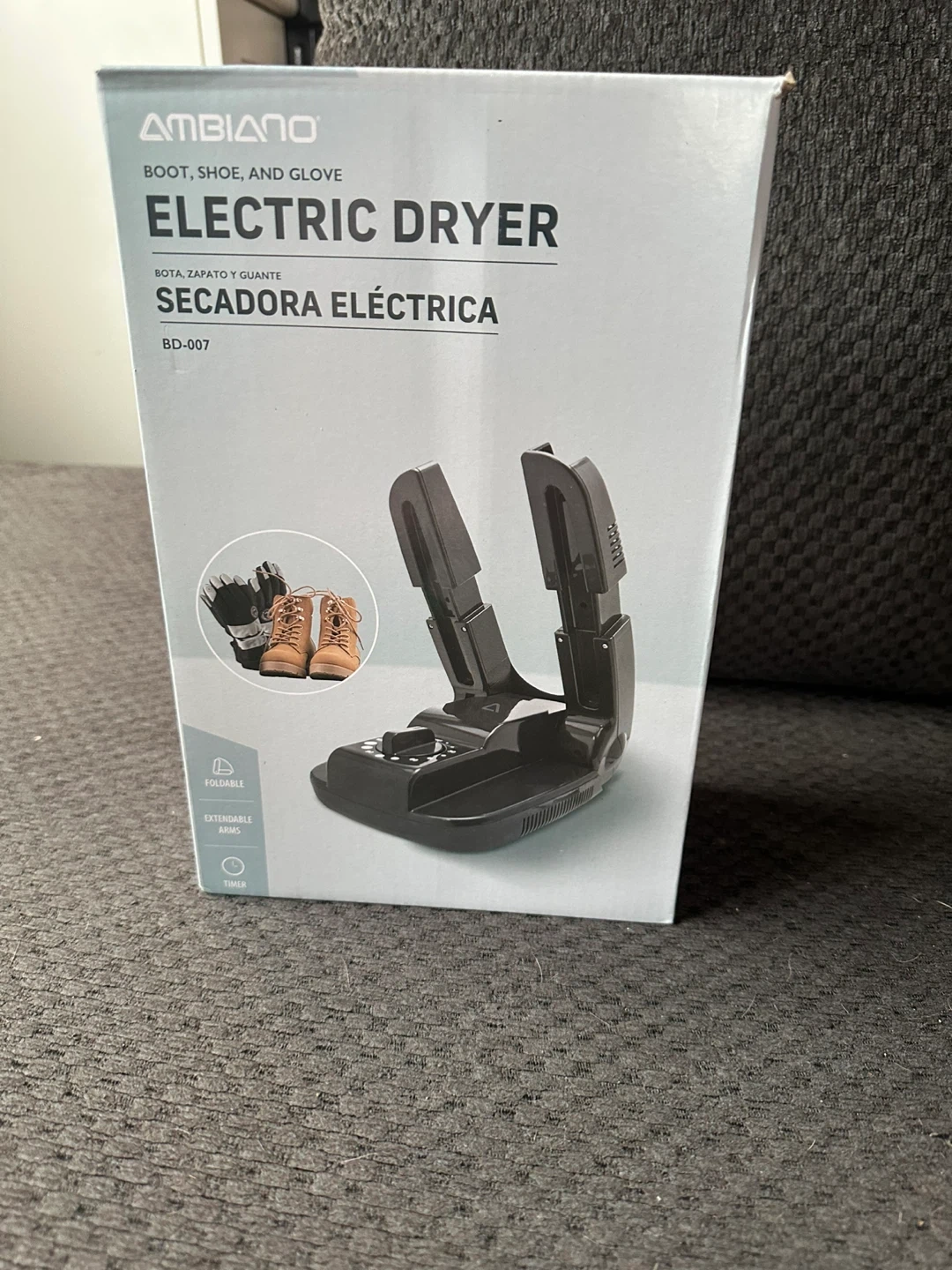 Selling a brand new Ambiano electric dryer for boots, shoes, and gloves! It gently blows warm air for faster drying and has an easy-to-use control dial with an adjustable timer up to 120 minutes, featuring automatic shut-off.