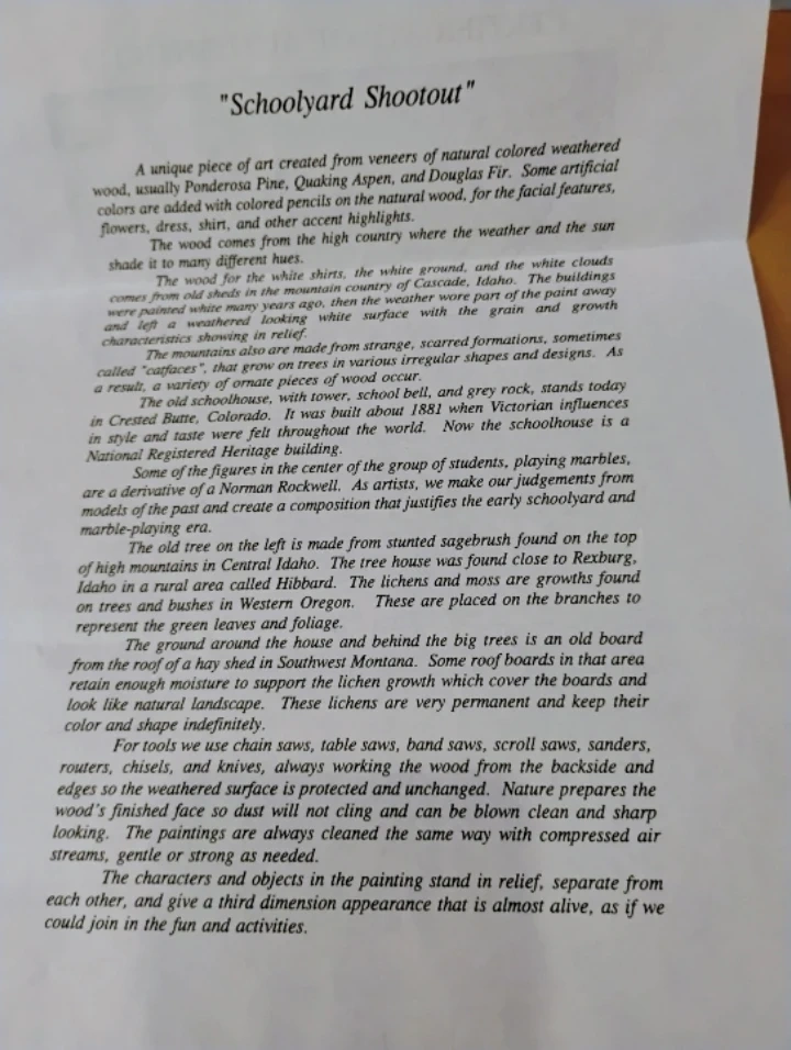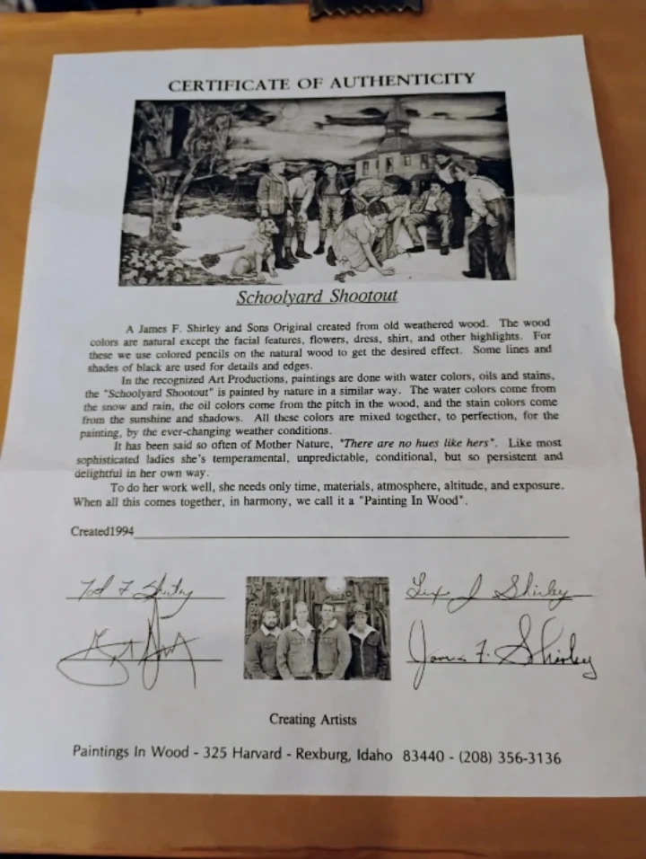 This "Painting In Wood" art piece is titled "Schoolyard Shootout" and was created in 1994. It's made from veneers of natural colored weathered wood and utilizes colored pencils, water colors, oils and stains. The art is presented with a certificate of authenticity from Paintings In Wood.