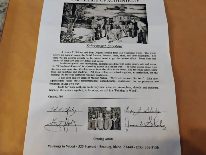 This "Painting In Wood" art piece is titled "Schoolyard Shootout" and was created in 1994. It's made from veneers of natural colored weathered wood and utilizes colored pencils, water colors, oils and stains. The art is presented with a certificate of authenticity from Paintings In Wood.