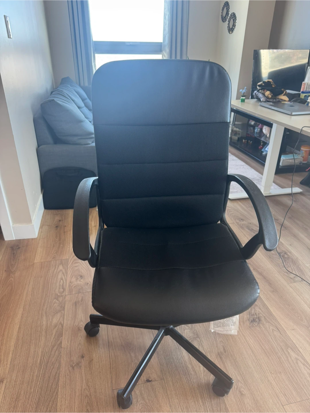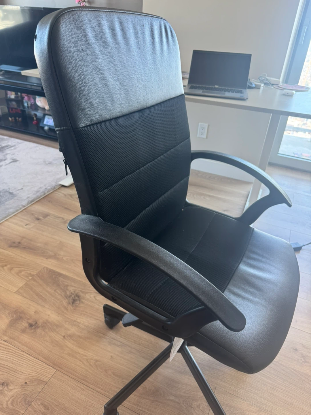 This is a black office chair. It features a faux leather exterior with a fabric insert on the seat and back. It's height-adjustable and swivels.