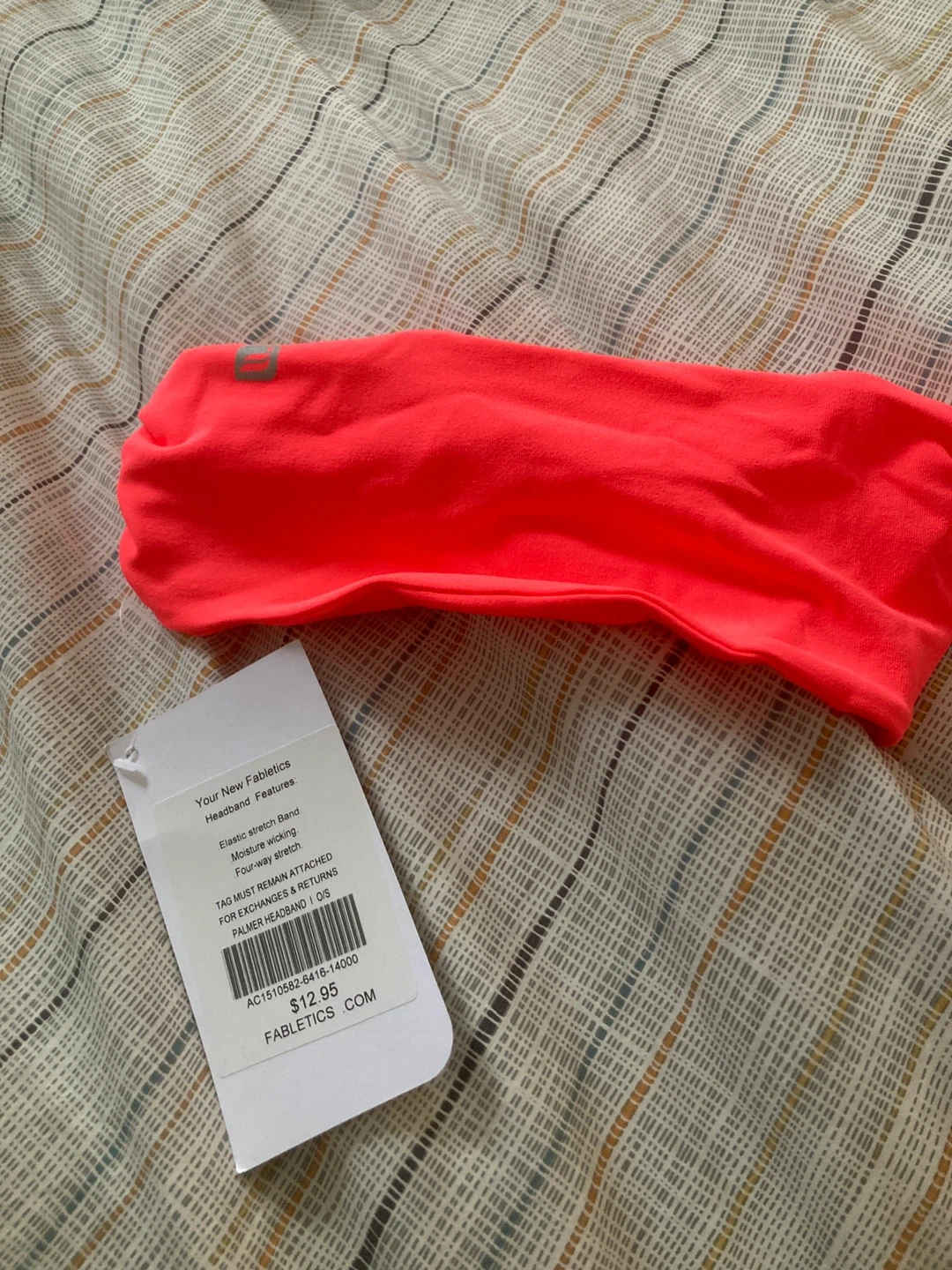 Fabletics Palmer Headband in a bright neon coral colour. It's an elastic stretch band with moisture-wicking and four-way stretch features. This is one size fits all. Originally $12.95