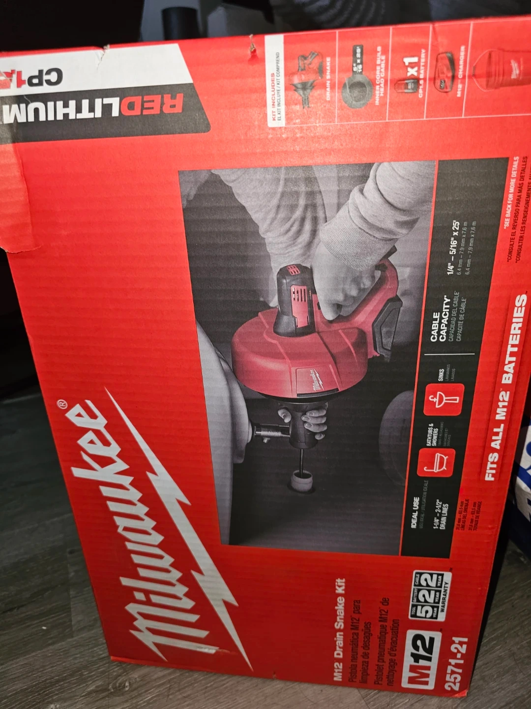 Milwaukee M12 Drain Snake kit includes a 5 Ah REDLITHIUM battery and M12 charger. It comes with a 5/16" x 25' inner drum cable and a 1/2" x 25' drain snake cable. Also includes a 5-gallon bucket and inner core bulb head cable.