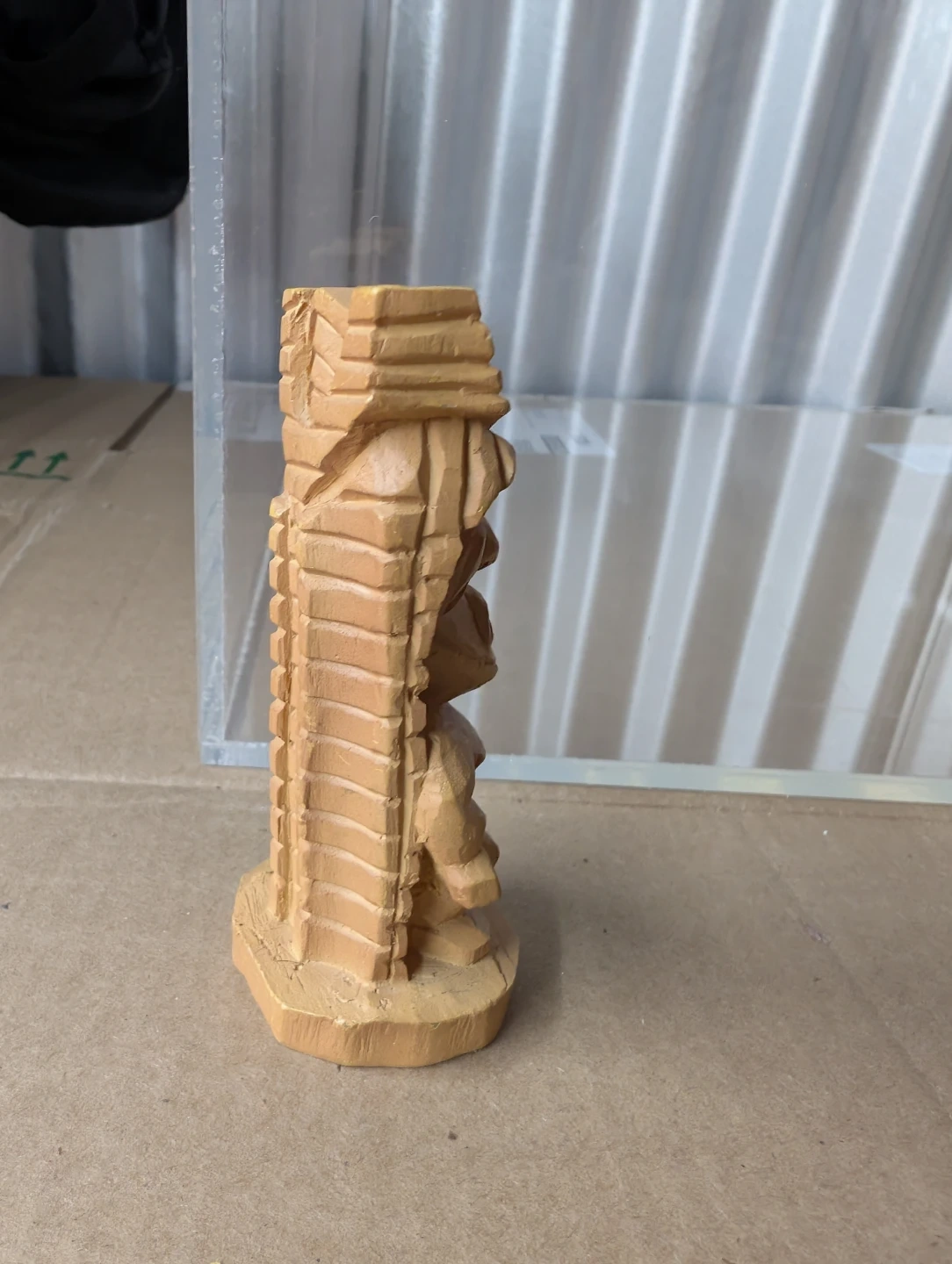 This is a wooden tiki statue. It's carved from light-coloured wood with intricate details. The statue depicts a traditional tiki figure with a distinctive headdress. It's a neat decorative piece!