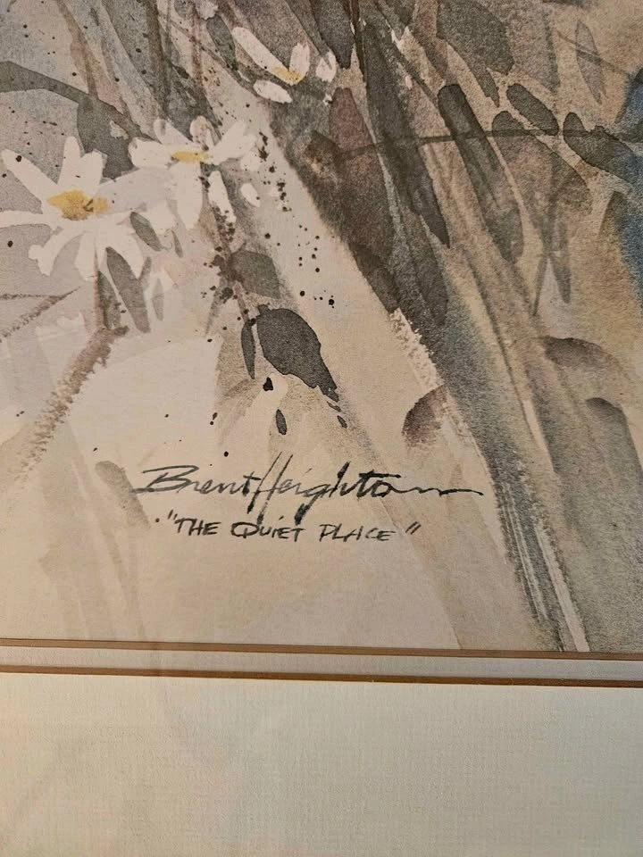 Beautiful framed watercolor print by Brent Highton, titled 'The Quiet Place'. It features delicate wildflowers, poppies, and daisies, along with a detailed spiderweb with dewdrops. The piece is presented in a gold-tone frame with a cream mat. Approximate size is 27"x35". Pick up near Guildford Mall.
