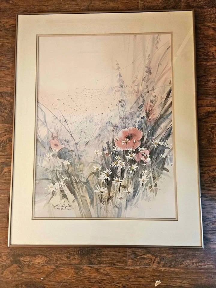 Beautiful framed watercolor print by Brent Highton, titled 'The Quiet Place'. It features delicate wildflowers, poppies, and daisies, along with a detailed spiderweb with dewdrops. The piece is presented in a gold-tone frame with a cream mat. Approximate size is 27"x35". Pick up near Guildford Mall.