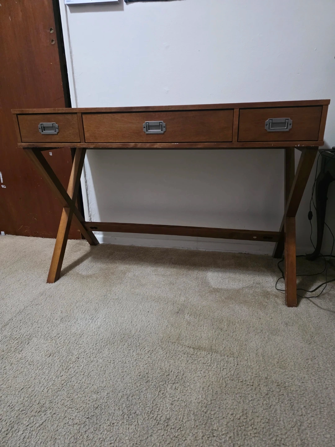 This wooden writing desk features a rustic charm with its warm wood tone and three convenient drawers. The X-leg design adds a touch of modern flair. It's perfect for a home office or study area! Wood construction.