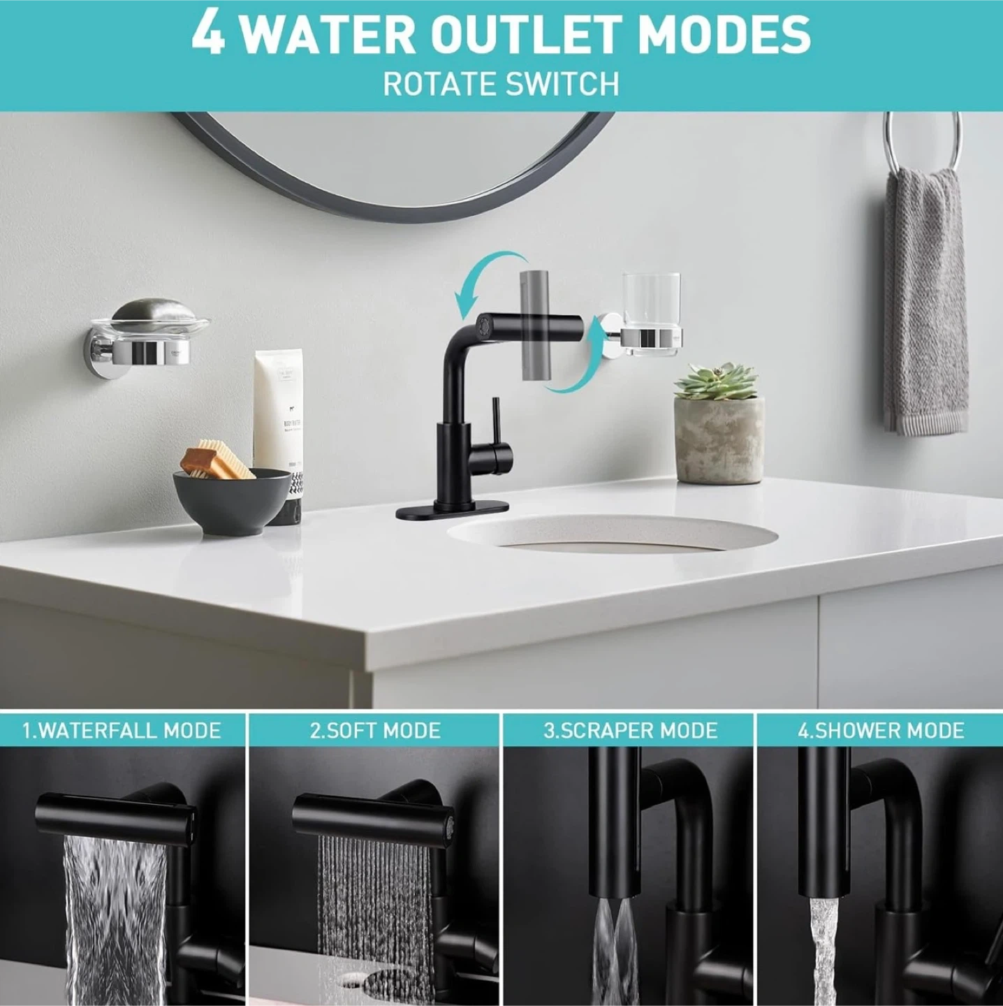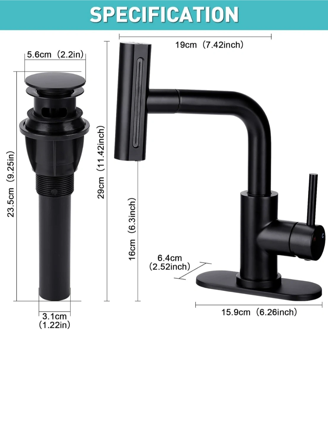 a pull-down sprayer and a matching drain assembly. It offers four water outlet modes: waterfall, soft, scraper, and shower. The faucet height is 29cm (11.42in) and the base is 15.9cm (6.26in).