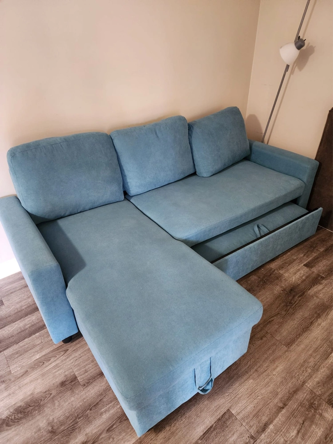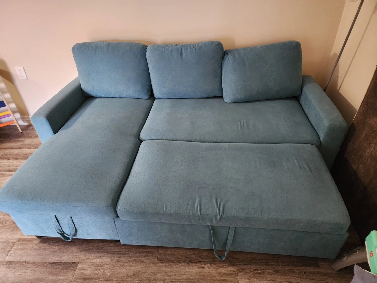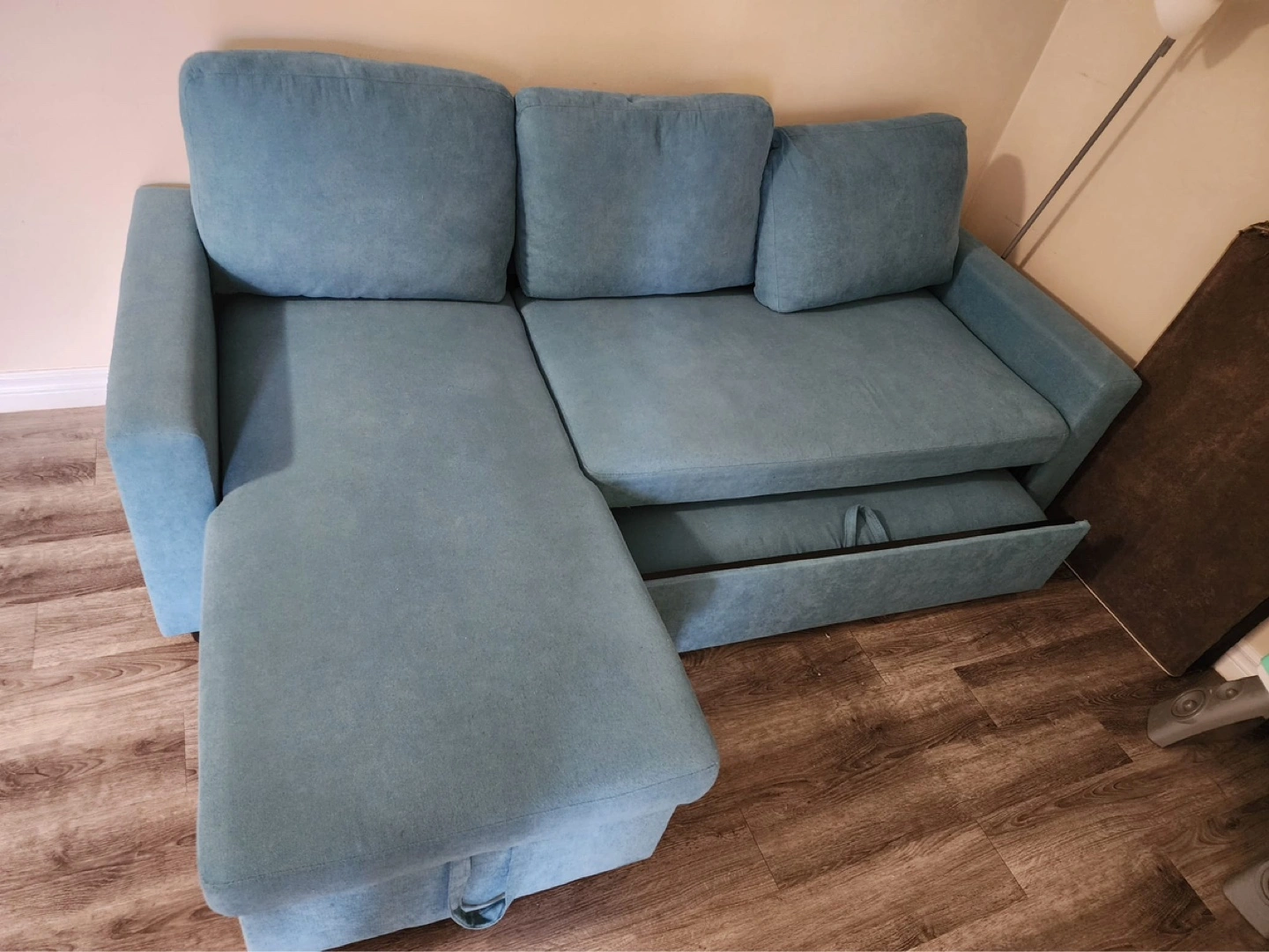 Comfortable teal fabric sectional sofa bed. Pull-out reversible chaise and storage underneath. Three included back cushions. Like New condition.