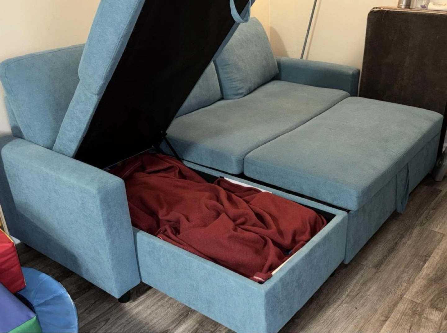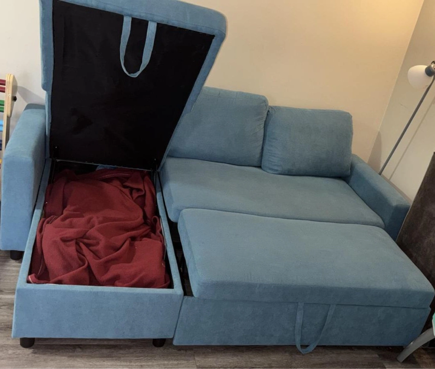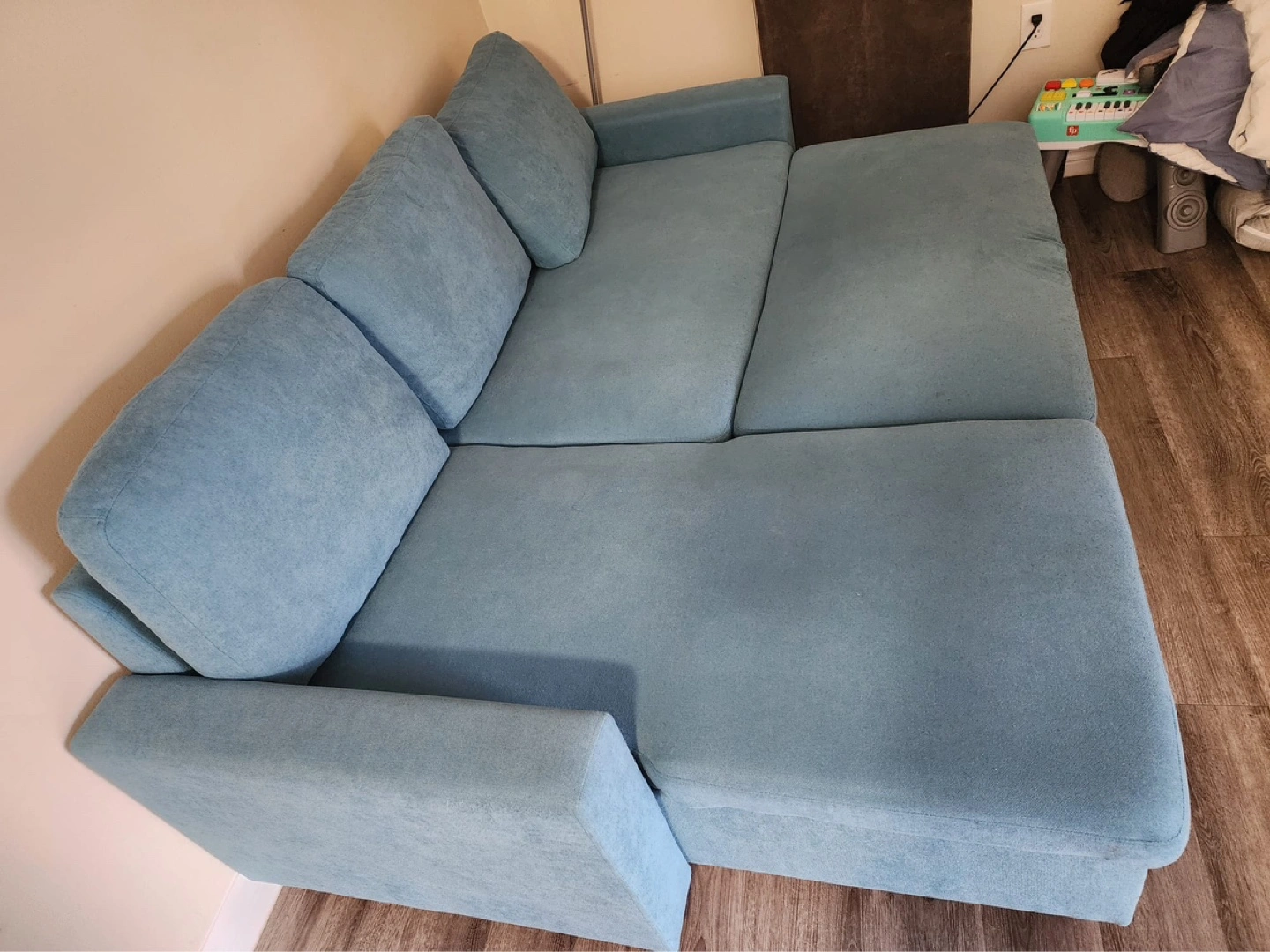 Comfortable teal fabric sectional sofa bed. Pull-out reversible chaise and storage underneath. Three included back cushions. Like New condition.