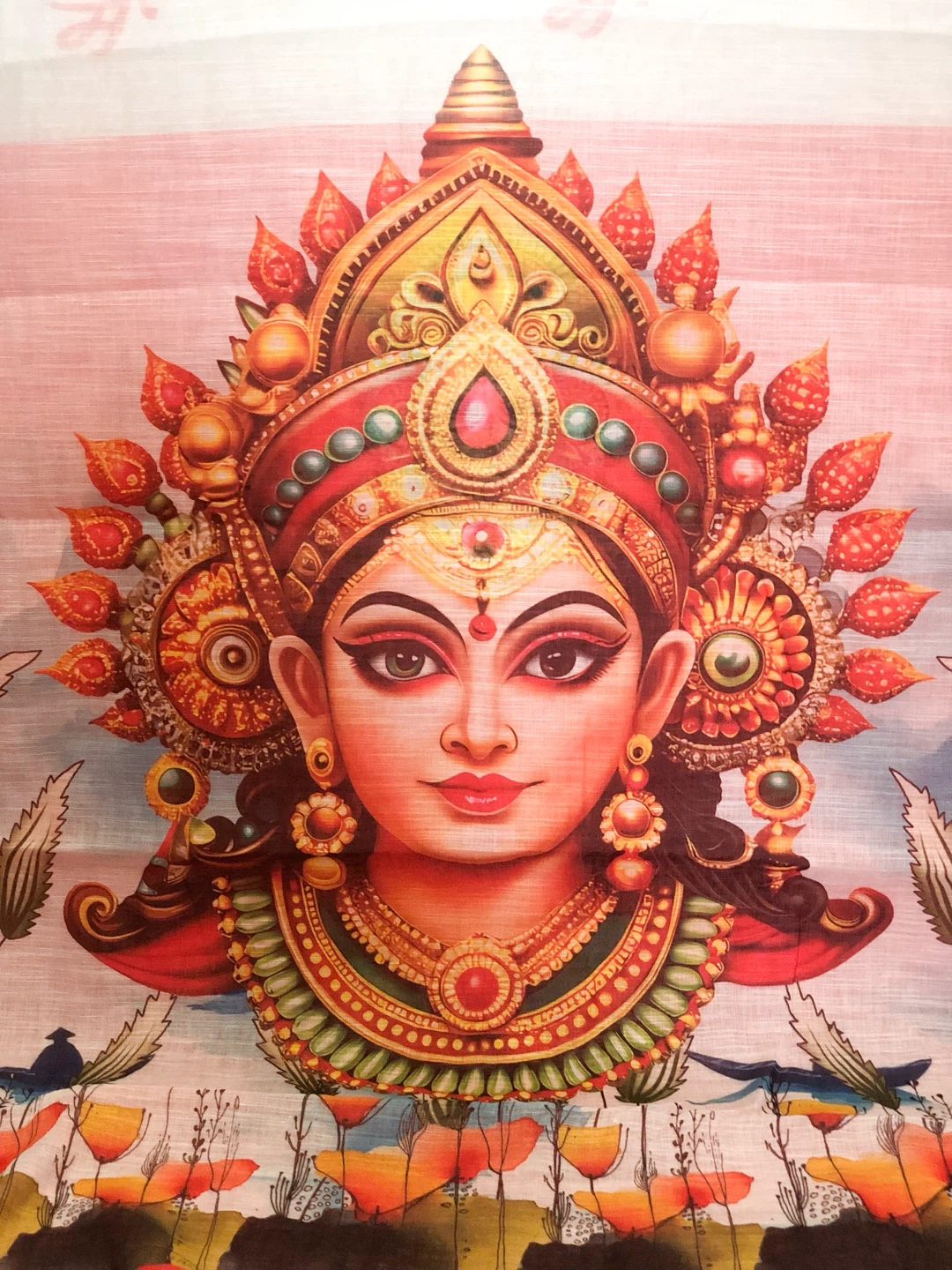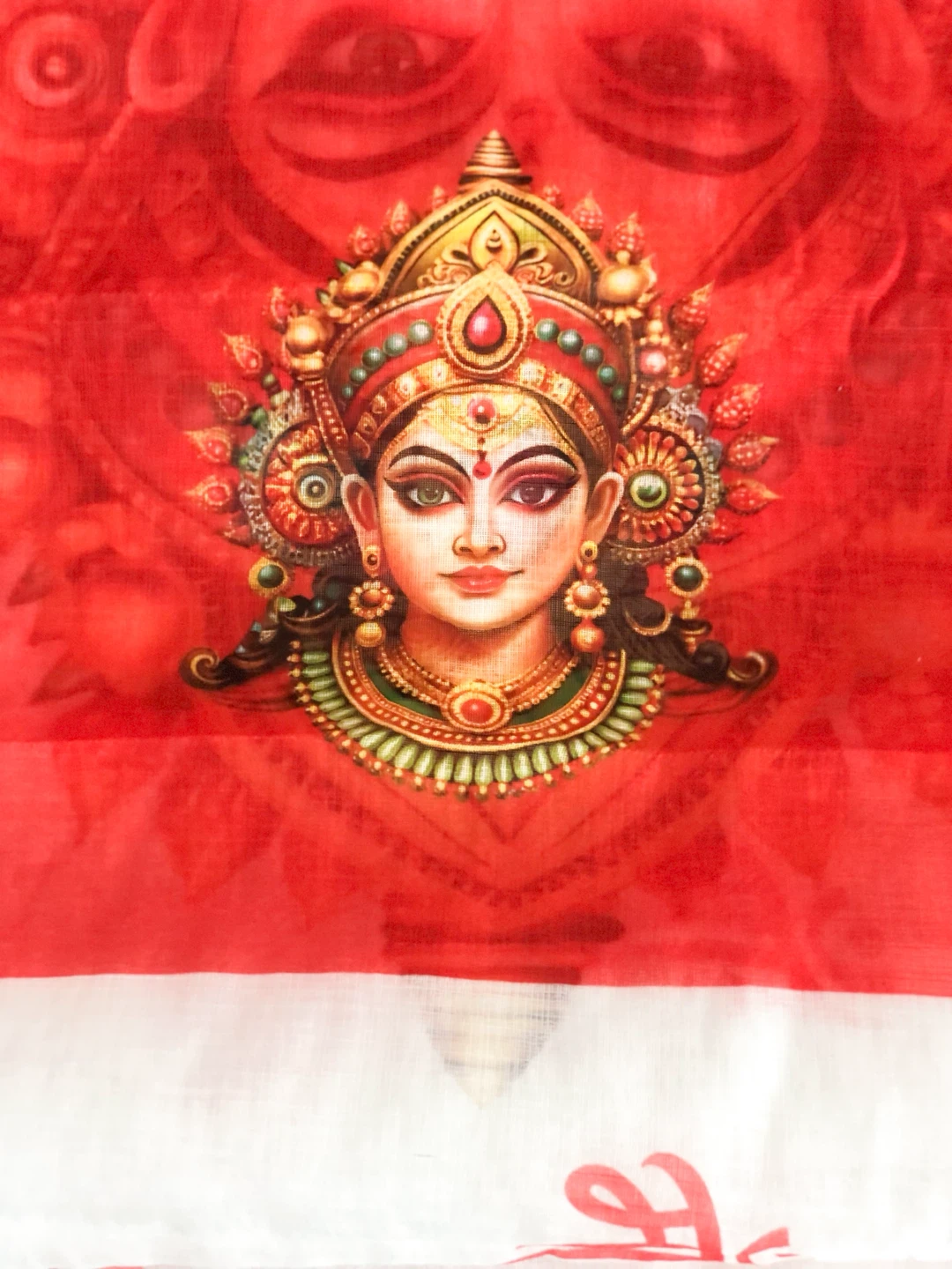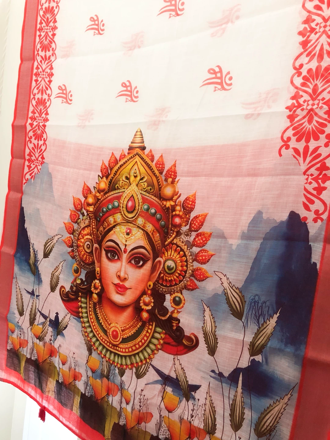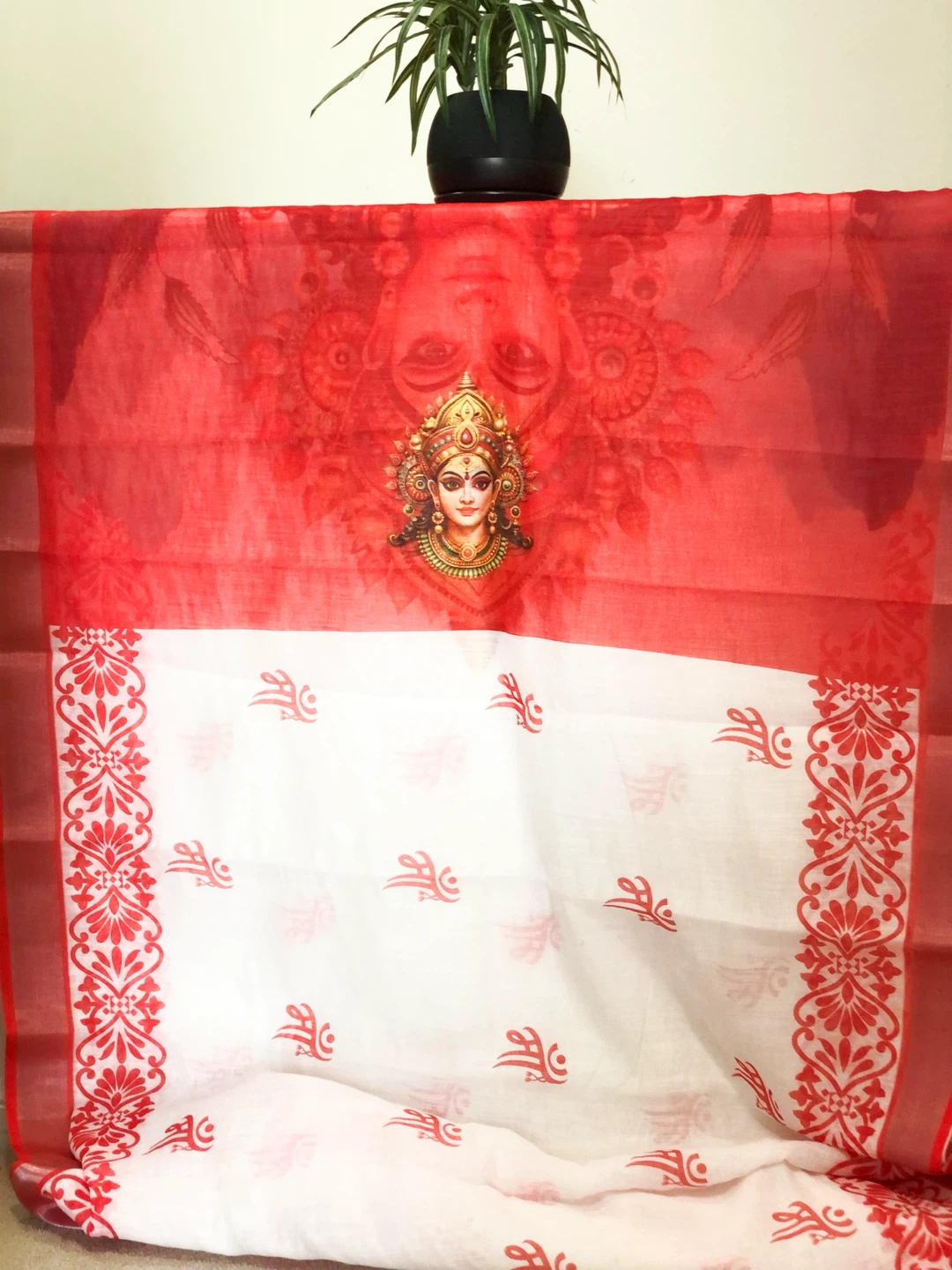 Beautiful women's saree featuring a vibrant red and white design with a prominent goddess print. It's made from lightweight fabric, perfect for cultural events or festive occasions.