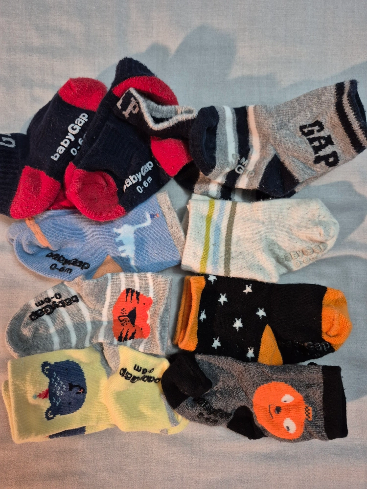 A cute collection of Baby Gap socks for little ones aged 0-6 months! There are various colours and patterns, including stripes, stars, and fun animal designs. Perfect for keeping those tiny toes warm and stylish.